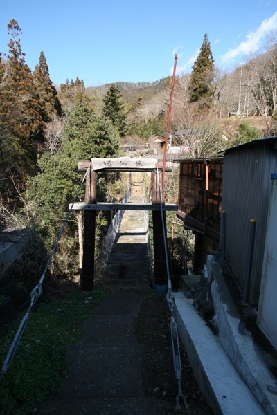 タクシーで「浅利の吊橋」へ。ところがこれが通行止めになっているではありませんか。渡った向こう側に何軒かの家があって車で入れるので、道はこの歩道橋だけではないはずですが、どれほど大回りしなければいけないか、時間がちょっと気になりました。