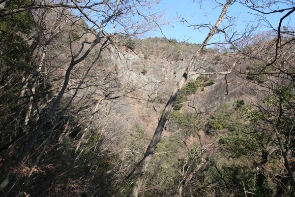 正面の岩壁の上を左から右へと渡ります。この深い谷は馬蹄形にえぐられているだけなので、流水による浸食とは考えられず、やわらかな礫岩がすこしずつ剥離していったのだろうというのがシロウトの見立て。岩殿山ではかなり大規模な地すべりが発生して、1972年に中央自動車道が123日間不通になったといわれています。この先の鎖場のところでは近年そういう剥離を心配して除去作業を行ったともいわれています。岩殿山の大岩壁も、そういう目で見ればスパッと剥離した岩が桂川の谷に落ちて、新たな絶壁が残ったというふうに感じられます。