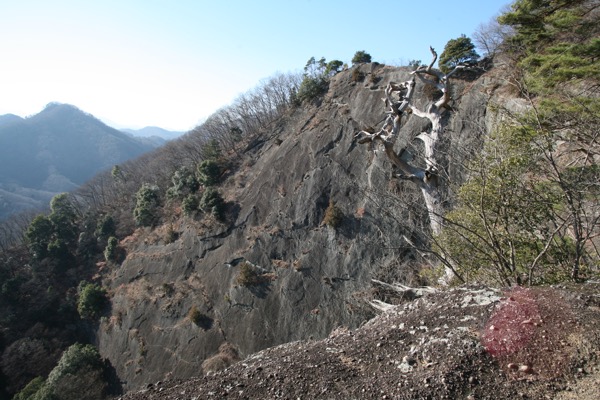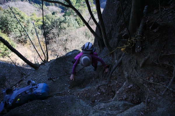 稚児落しに出ました。右側がスパッと落ちているのですが、柵もなければ立て札もないので、ちょっとよろめいたりすると、絶望的な状態になると思われるところ。こういう場所で「見えない怖さ」を感じない人がいたりするので、初参加の人がいるときにはものすごく注意します。