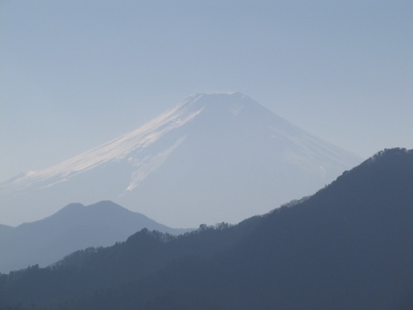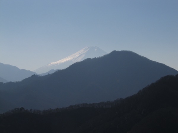 富士山の手前にかる山は大月駅から向こうに歩いて行けば登れる高川山。手前の斜面はさっき登ってきた、稚児落しの向こう側です。