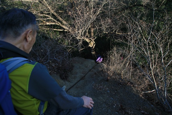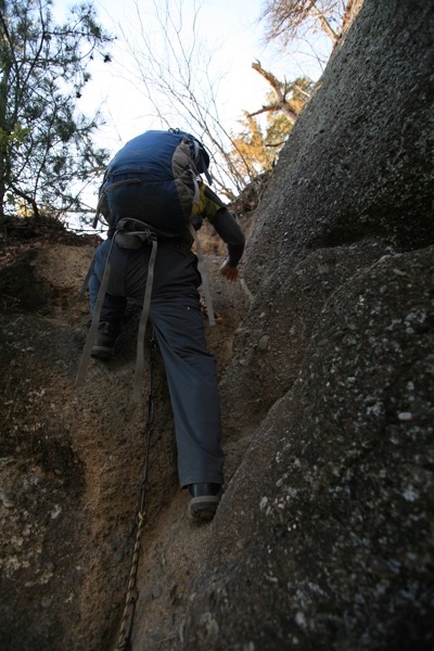 これがクサリ場の最上部から踊り場へと降りるところ。「三点支持」のできない人にはそうとう危険なところで、この状態で下から足場を指示しないとちょっと怖い場面もありそうです。もしドジると、たぶん止まらずに行ってしまいます。初心者の場合はロープで確保してクサリ場通過のきちんとした体験の場と考えるほうが安全で合理的です。クサリ場初心者がいる場合は、巻道を選ぶことも可能です。