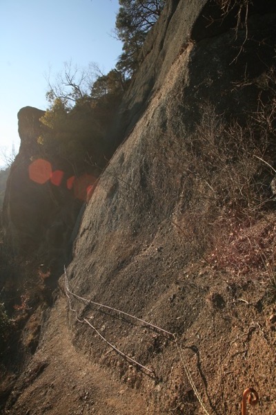 これが兜岩の岩壁。木の枝の見えているあたりからクサリを下って、このトラバースルートをたどります。この部分、岩の状態が不安定になったとかで、一時期通行できなくなったことがあります。