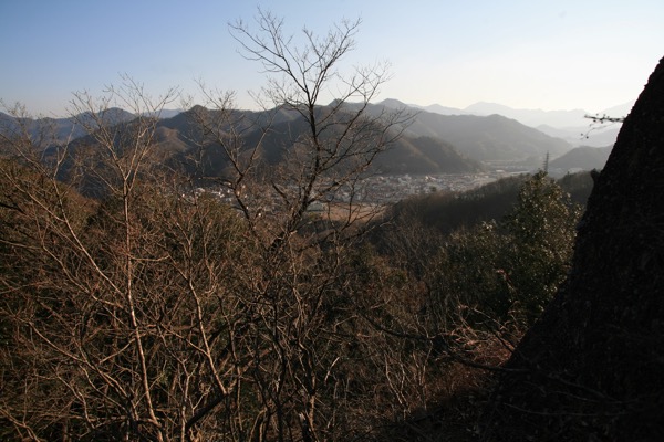前方には岩殿山。右下には中央自動車道があり、桂川の谷があり、大月の町並みが広がっています。