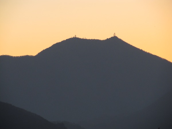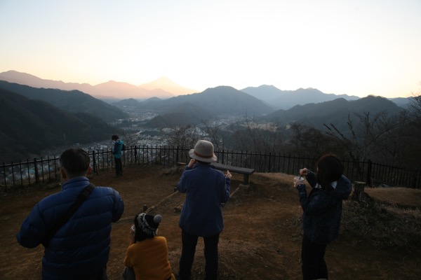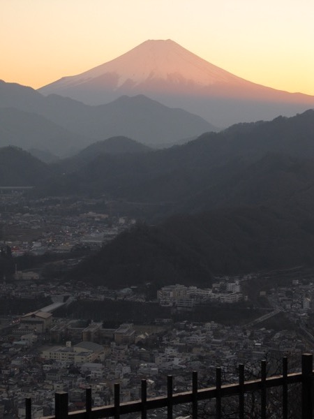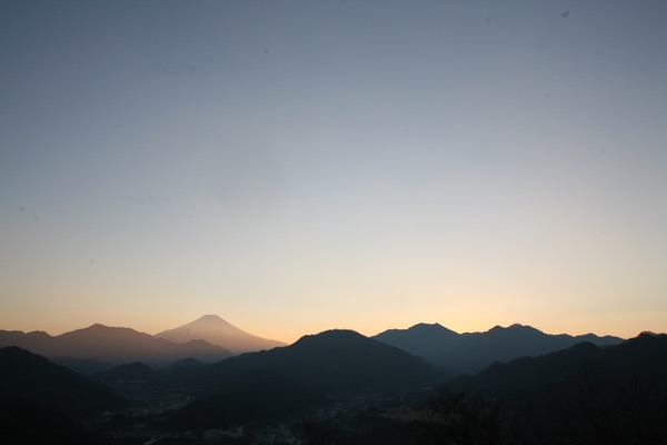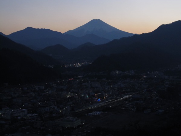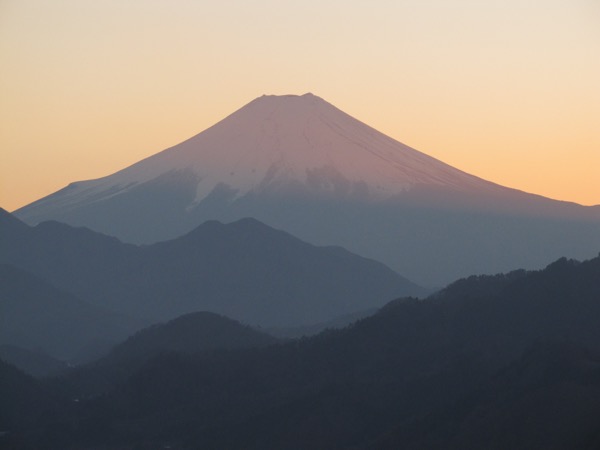 黄昏のなかで、富士山は美しく見えていました。右手前の山が高川山でその右に太陽が落ちた三ッ峠山があります。