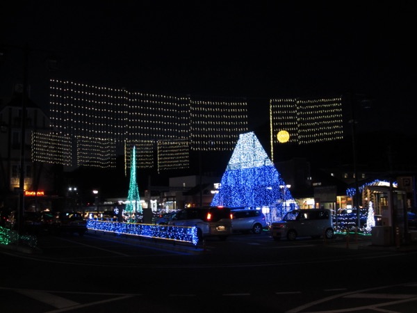 街の明かりがどんどん広がって、肉眼ではむしろ華やかな風景に見えています。山から見下ろす黄昏の町並みは印象的です。画面下部にうっすらと横に伸びるライトの線が見えるのは大月駅。そこに小さな青い点が見えますが、それは次の写真(39)で。