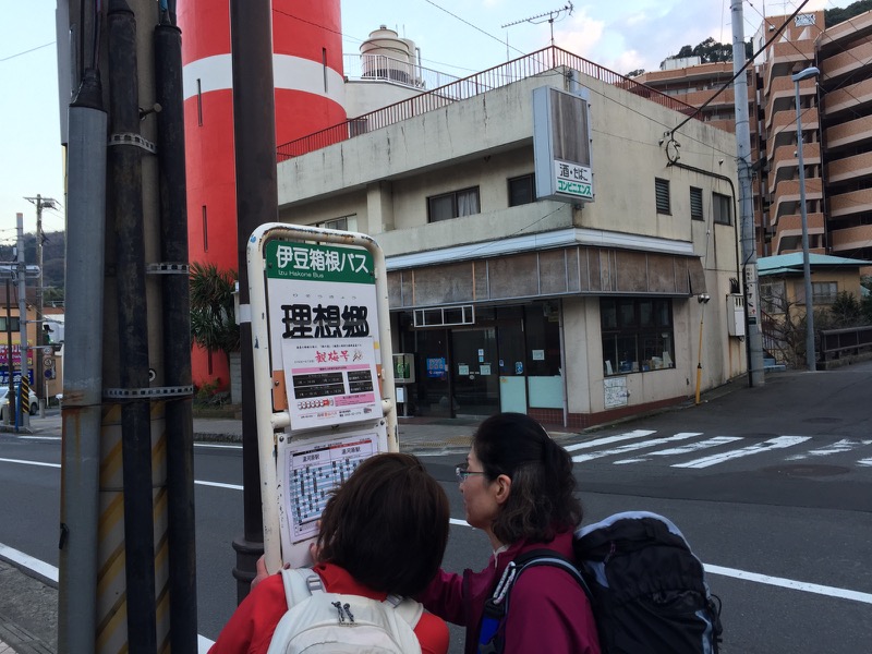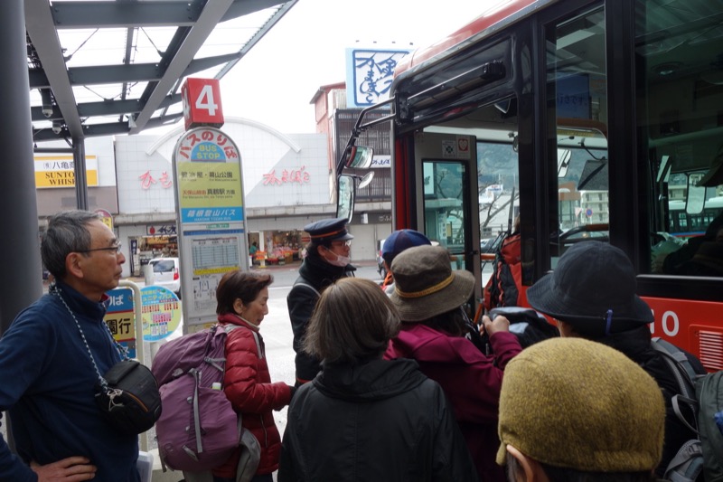 通常は鍛冶屋が終点の路線バス乗り場。しかし、幕山公園の「梅の宴」期間中は鍛冶屋を通らない臨時・直通急行バスが運行されることを知らなかった! 乗ってしまった皆さんは幕山公園から鍛冶屋まで歩いて戻るウォーミングアップ、ご苦労様でした。