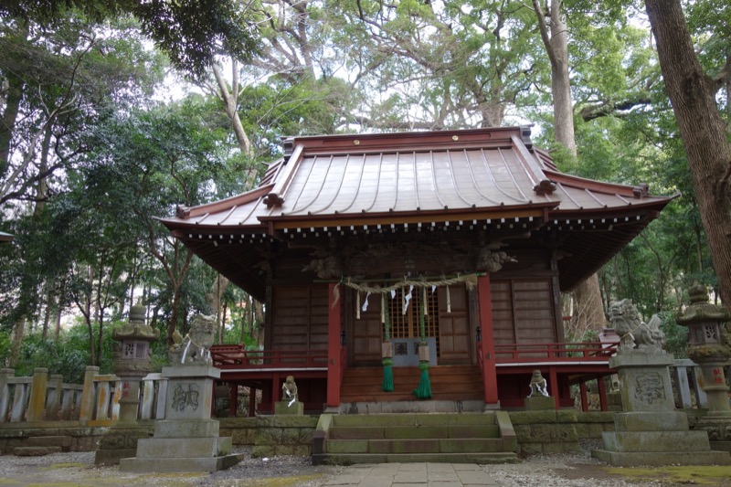 先発ウォーミングアップ付きの組だった私は、村社 五郎神社はトイレだけ。階段上の樹齢850年? のご神木を見そびれました。これは鳥居外のクスノキの巨木。十分な迫力です。頼朝の戦勝祈願も見たでしょうか。道すがら神社裏手にもたくさんの巨木がありました。