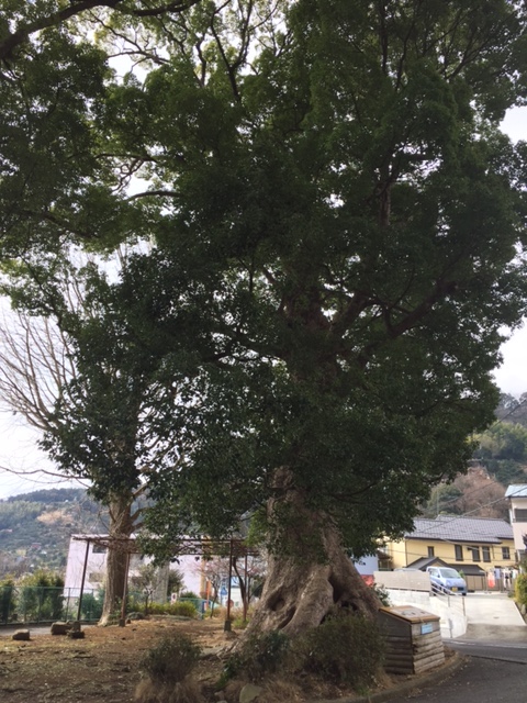 バスはこの大木をぐるっと一周して出ていきます。ちなみに五郎神社本殿の背後は深い森になっていて、ご神木としてこれより大きなクスノキがあるとか。