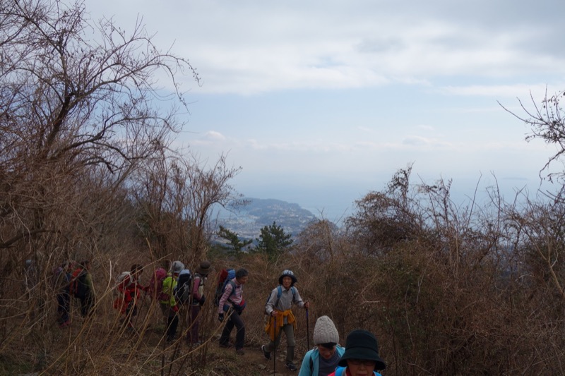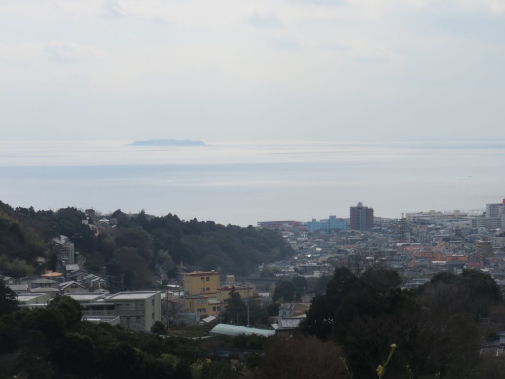 民家の脇の急坂を登り 一息ついて 振り返ると 眼下には 湯河原の町と 遠くには 平な初島が 霞んで浮かんでいた。