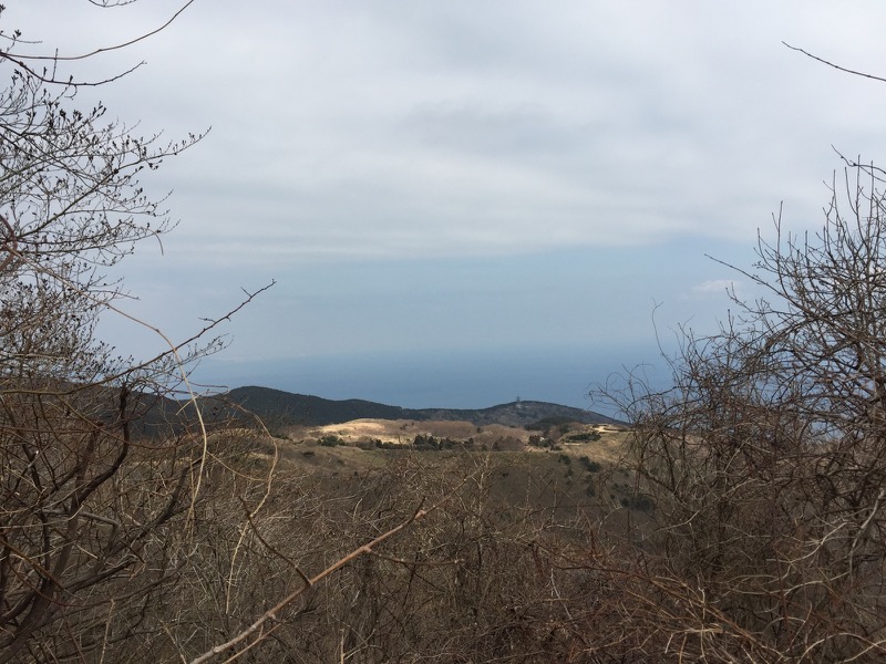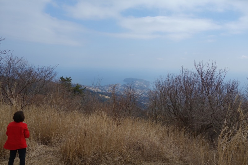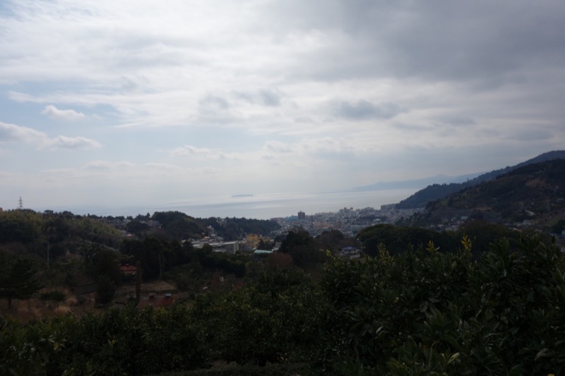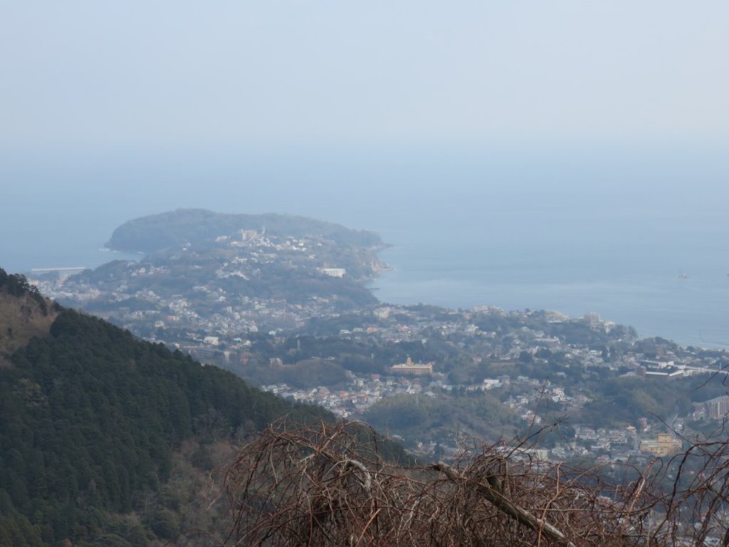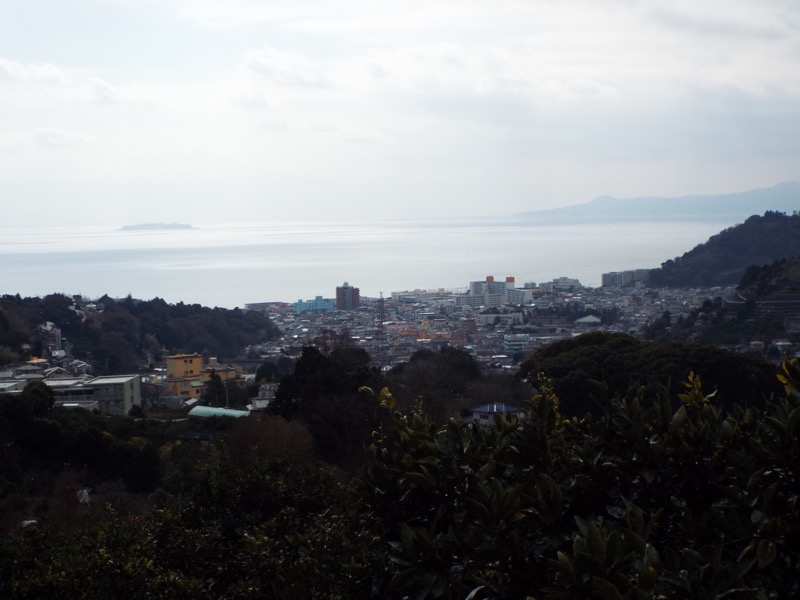 南郷山への道を登っていくと、湯河原の街が見えてきました。沖合に浮かぶのは大島ではなくて初島。右手奥には伊豆半島の大室山あたりが見えています。