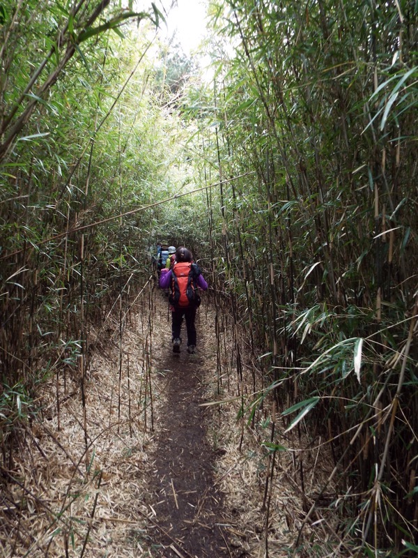 箱根から伊豆半島にかけて、こういう竹藪の道が多く見られます。ハコネダケだそうで、一般的にいう笹ヤブを切り開いた道です。ゴルフ場が終わるとこんな感じの、箱根の山という雰囲気に入り込んでいきます。