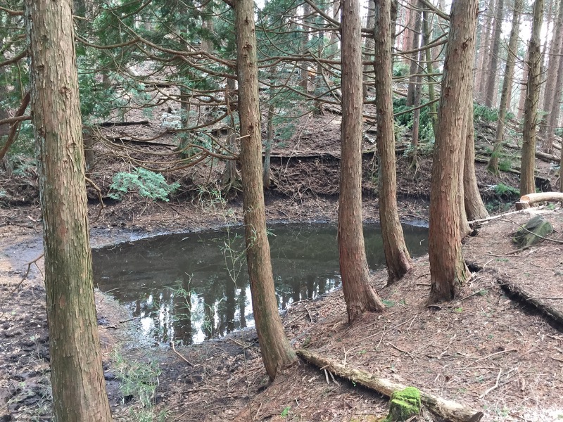 スギ・ヒノキの人工林に入りました。若き日の源頼朝の行動範囲がこのあたりにあったころ、ここは森林だったのか、竹藪だったのか?