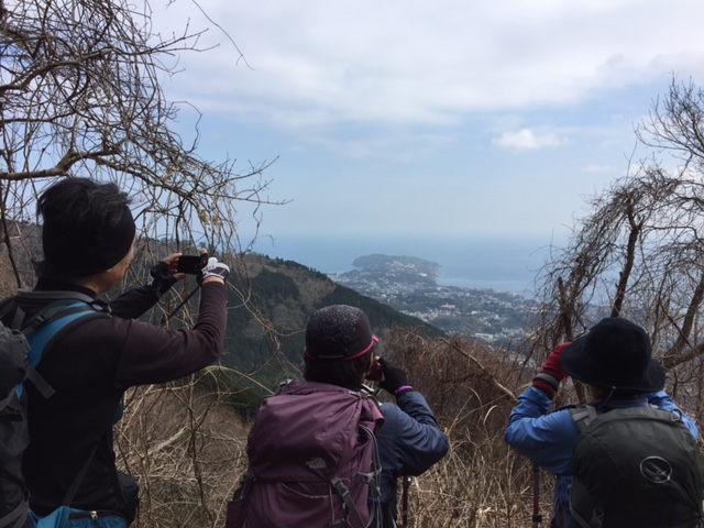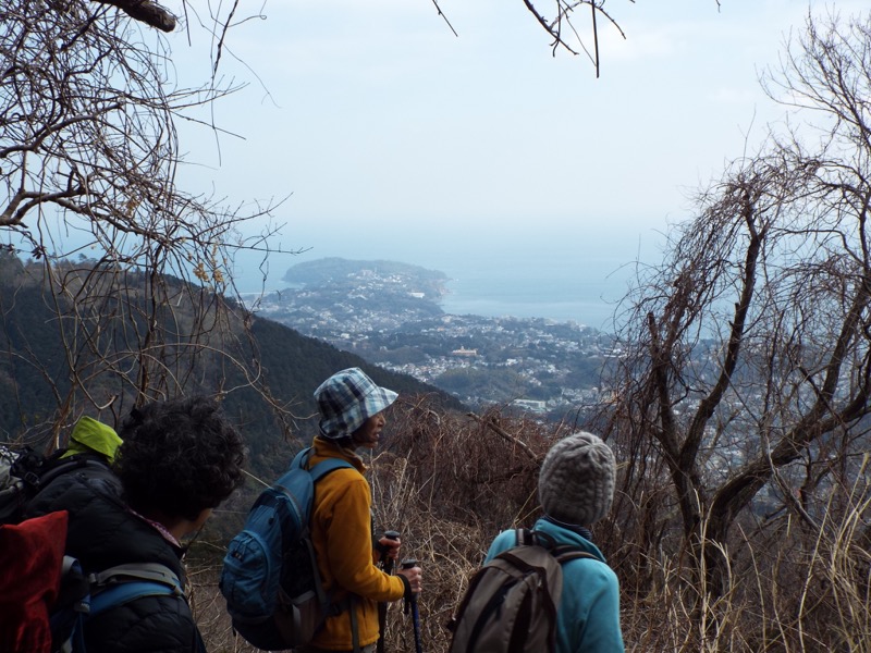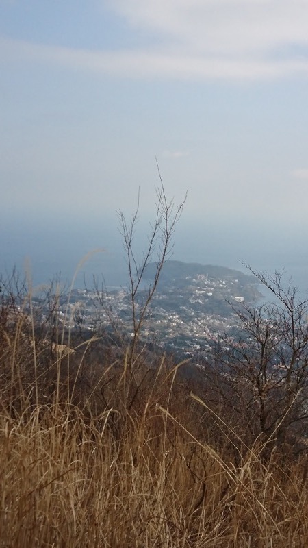 少し歩いて振り返ると視界が開け、湯河原の町と海が目に飛び込んできた。初島が近い。
