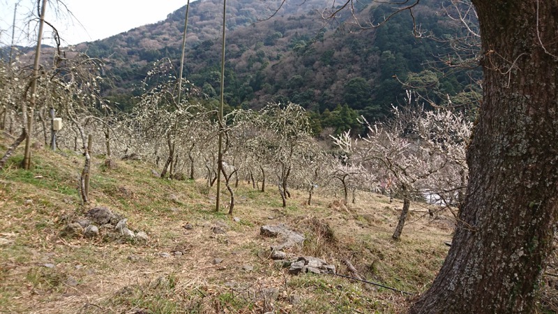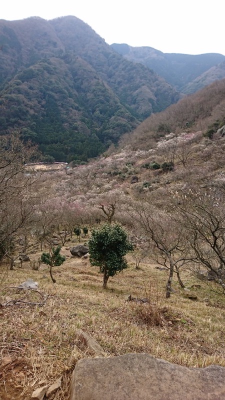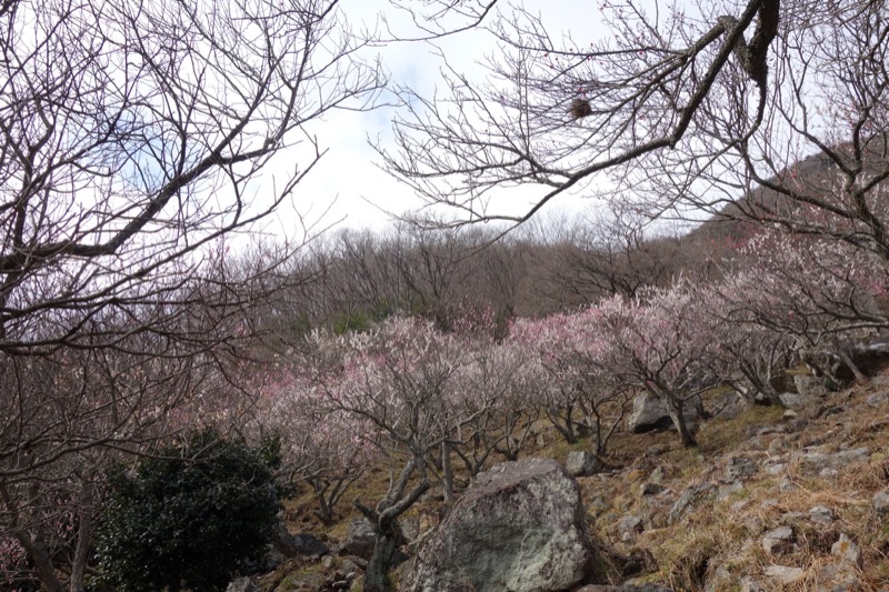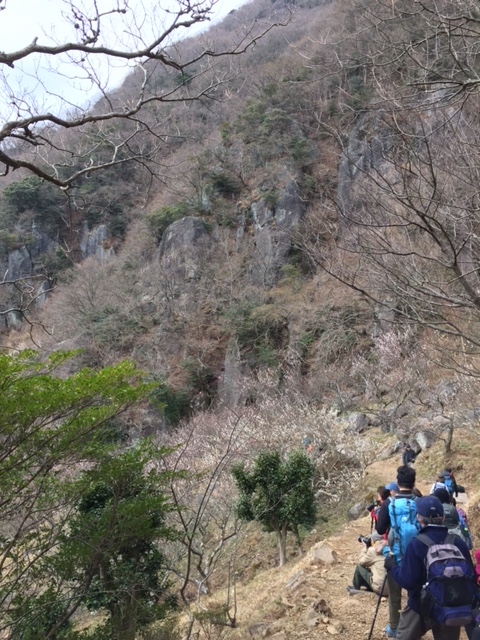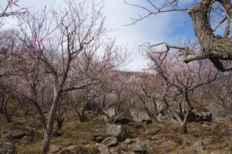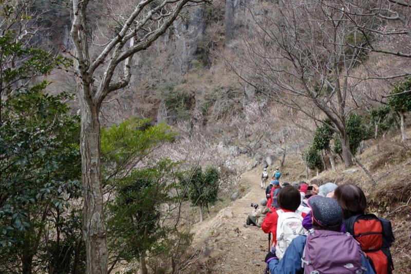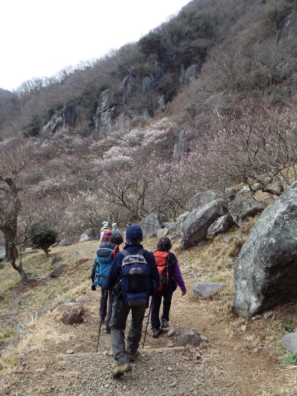 下っていくと突然梅林が始まります。正面の岩には、休日ならたくさんの登山者がクライミングの練習をしていますが、今日はどうでしょう。