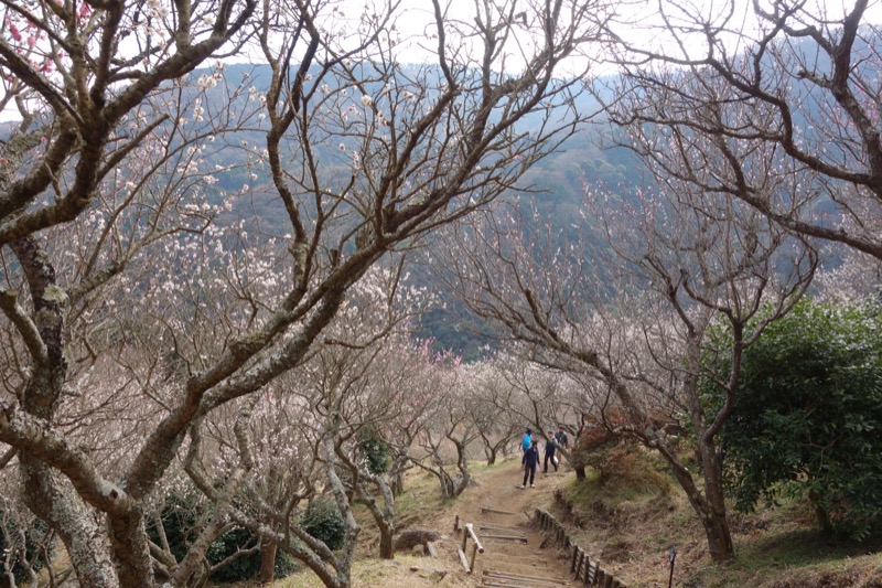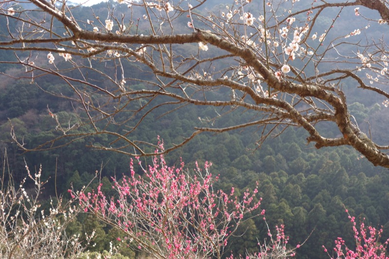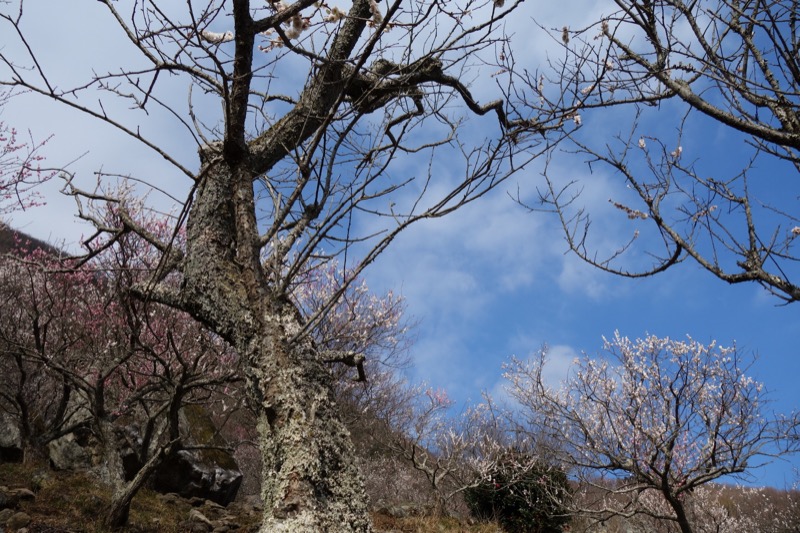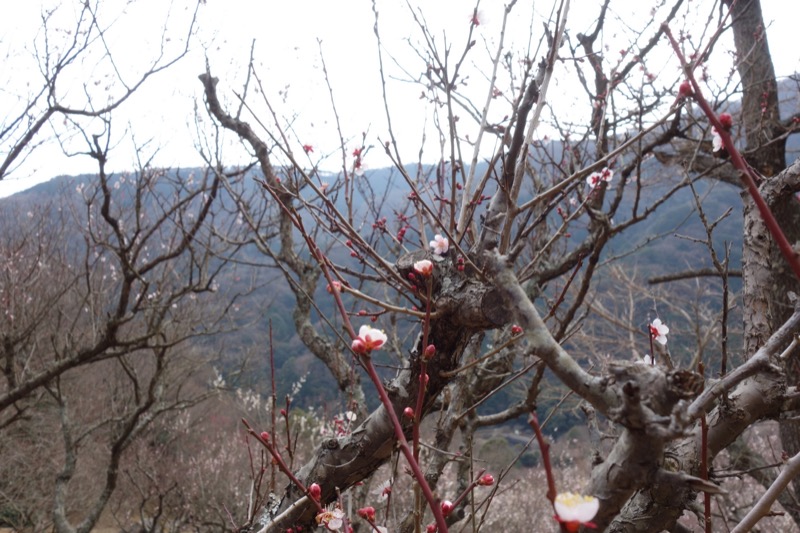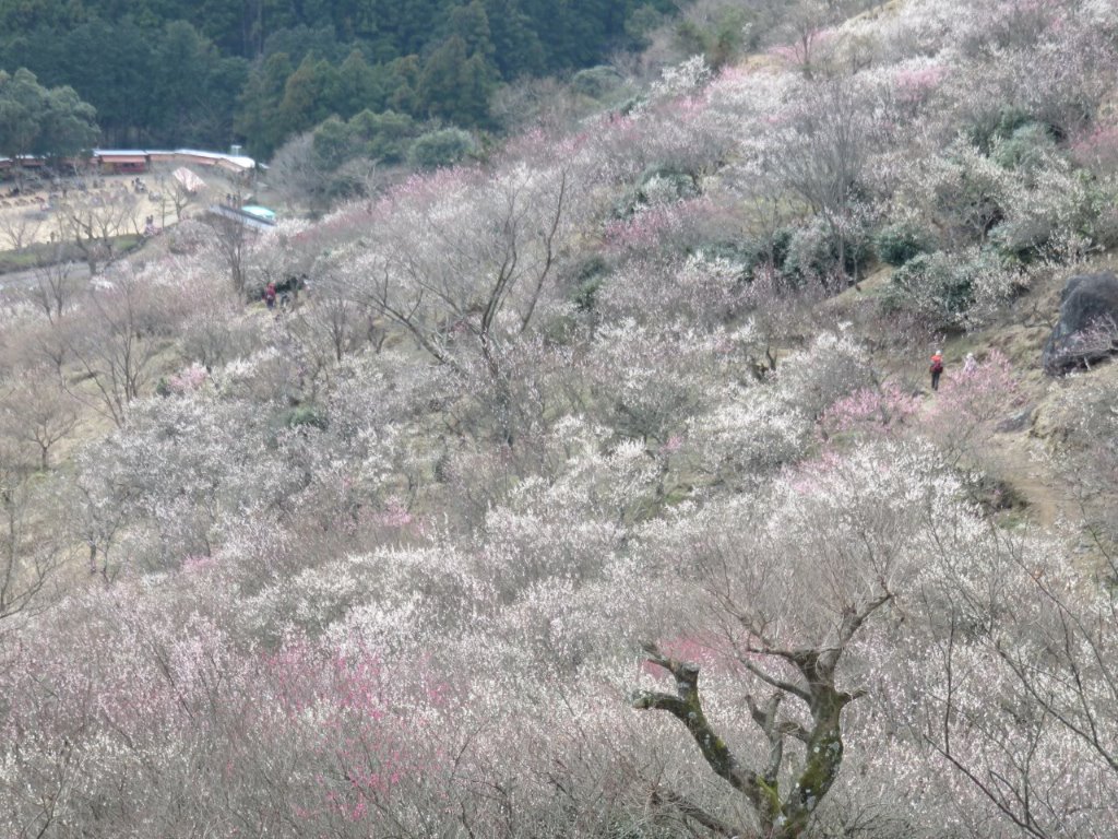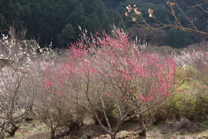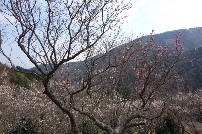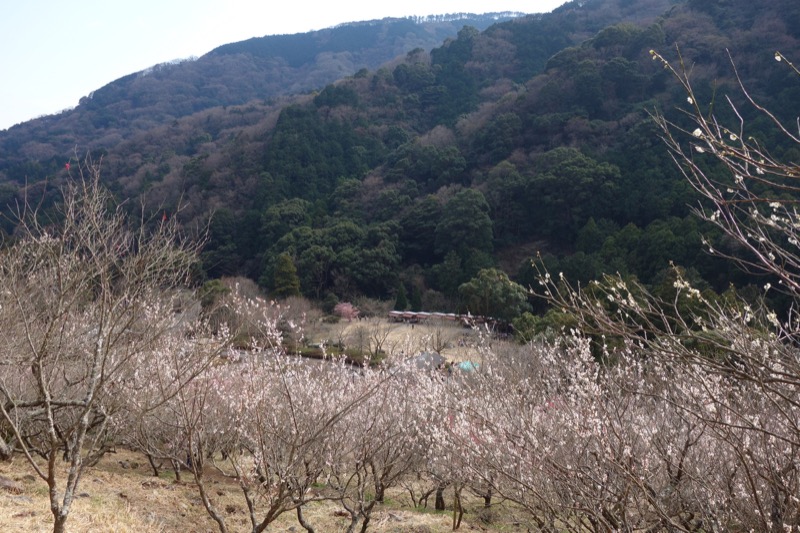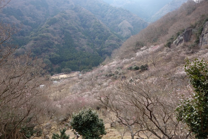 だんだんと全貌が現れてきた。ちょっとピークは過ぎた感じが否めないが、それでもこれだけの斜面に広がる梅林はなかなかだ。埼玉の越生の梅林は、風格のある古木がたくさんある観光梅林のほか、広い平地に梅栽培農家の整然と植えられた長閑な梅林が周囲をとり巻き、まったく趣が違う。
