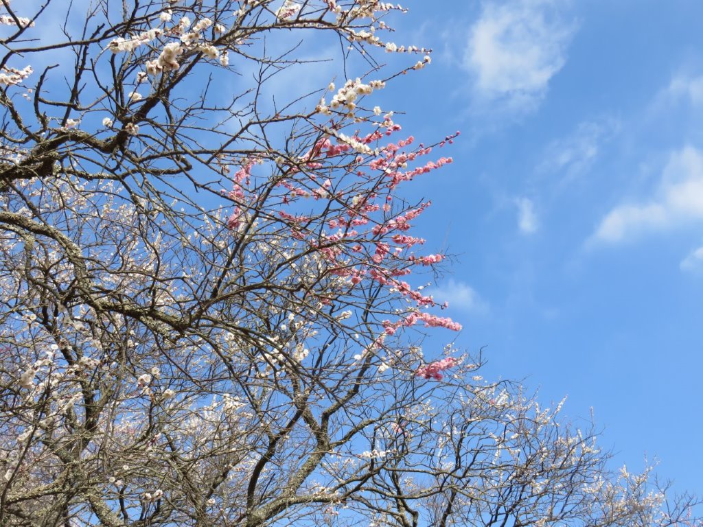 白い花が 多い中で 赤い梅は 際立っていた。青空に映える。