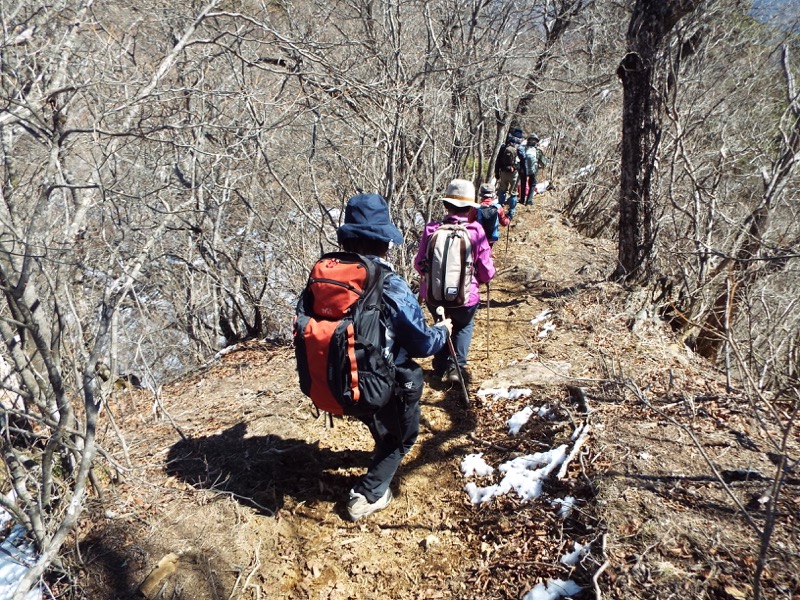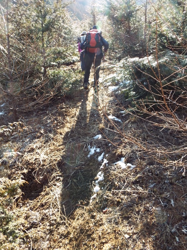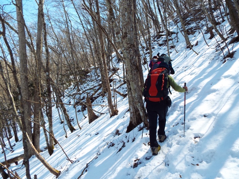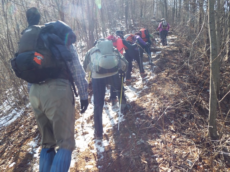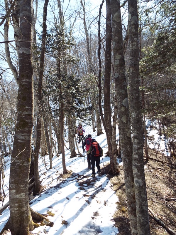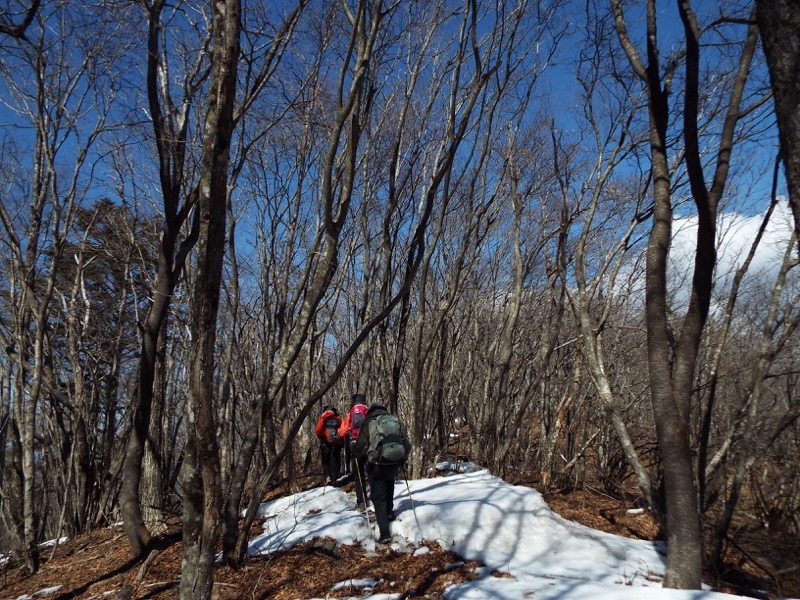 雪がパラパラと、足元に残っています。標高約1,100mあたりでこの状態、標高にして、あと500m以上登ります。周囲の山には雪面が見えますから、雪の状態によってはやっかいな場所も登場するかもしれません。