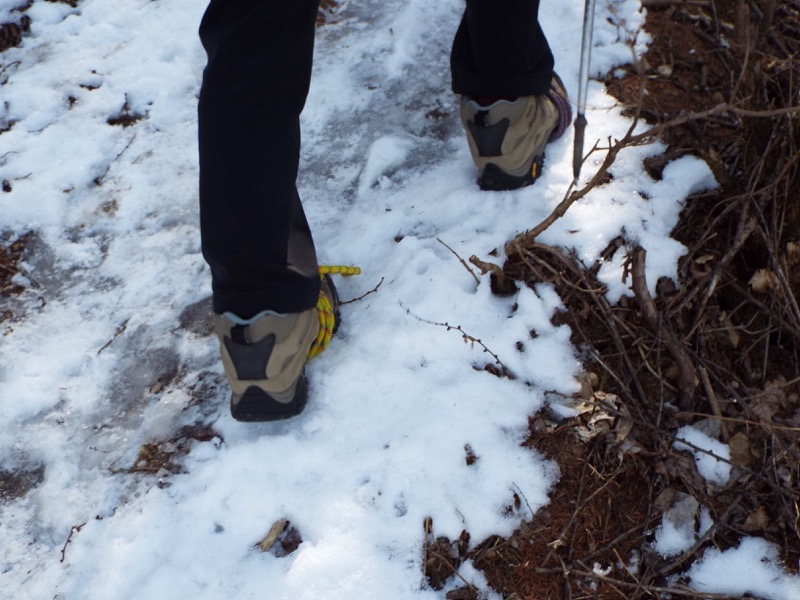 じつは計画書に「念のためアイゼン必要」などとも書いてありませんでした。参加者7人のうち5人は常備していましたが、2人が持ってきていませんでした。そこで靴にロープを巻いて歩いていただくことにしました。私も同様にして、これで危険を感じたら即撤退という余裕のない状態になりました。