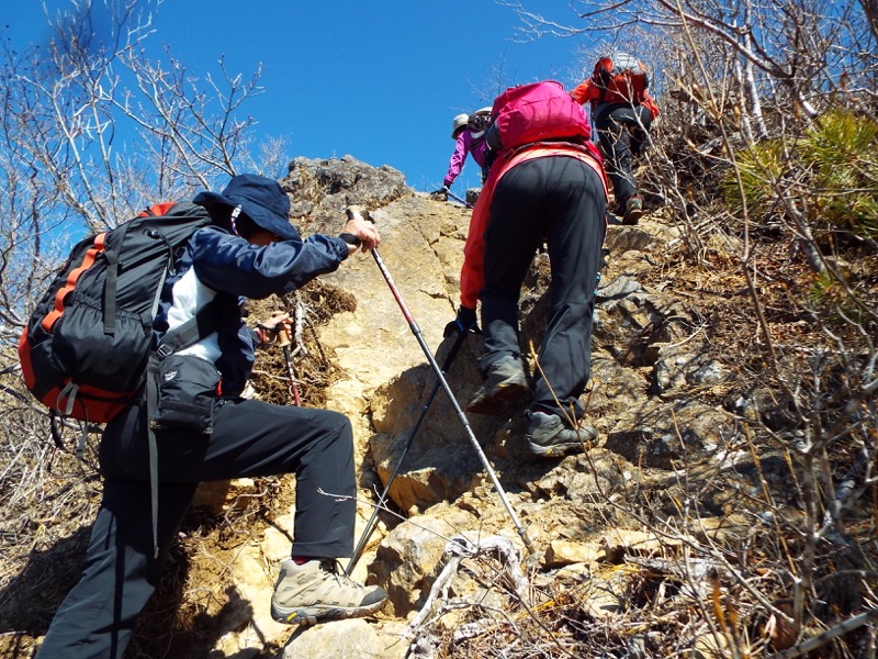 これぐらいの岩場は、ストックを足元について、腕で後ろから押し上げるように使うと楽ですし、安全です。ストックが本来岩場でも使われるように作られていると認識できないベテラン登山者は道具に関するセンスのない人と考えていいのです。