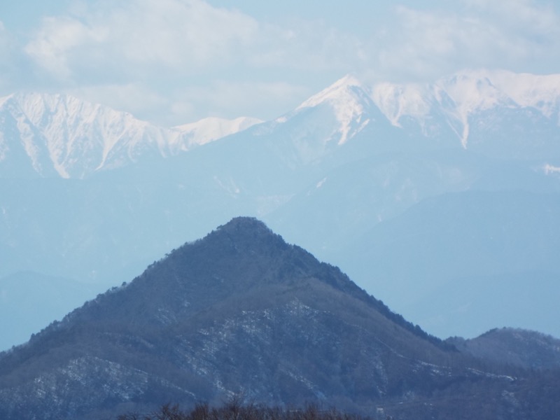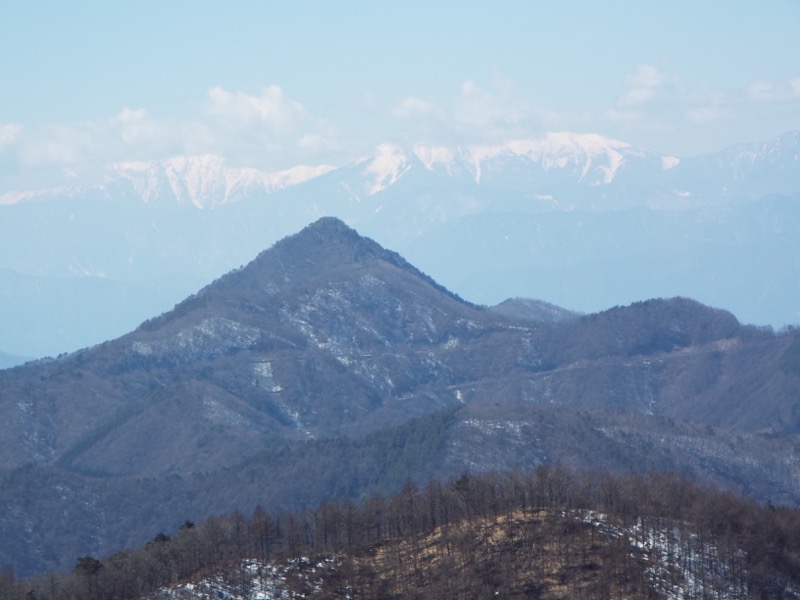展望が開けました。この見事なピラミッドは御坂山地の盟主・黒岳です。背後には南アルプス。赤石岳のあたりだと思います。