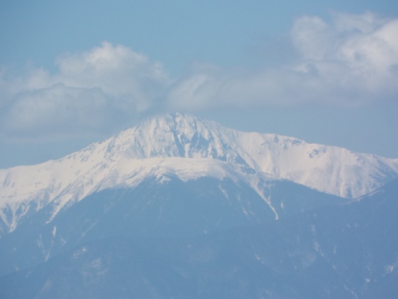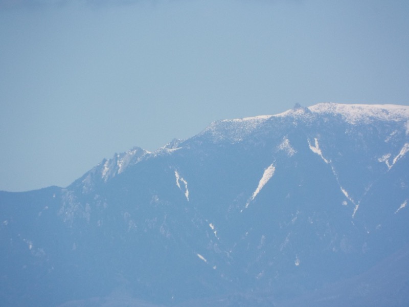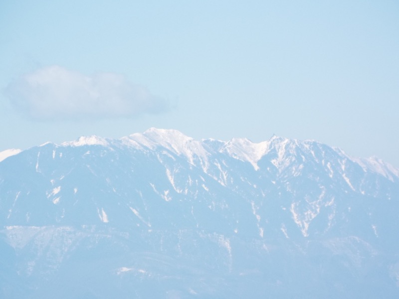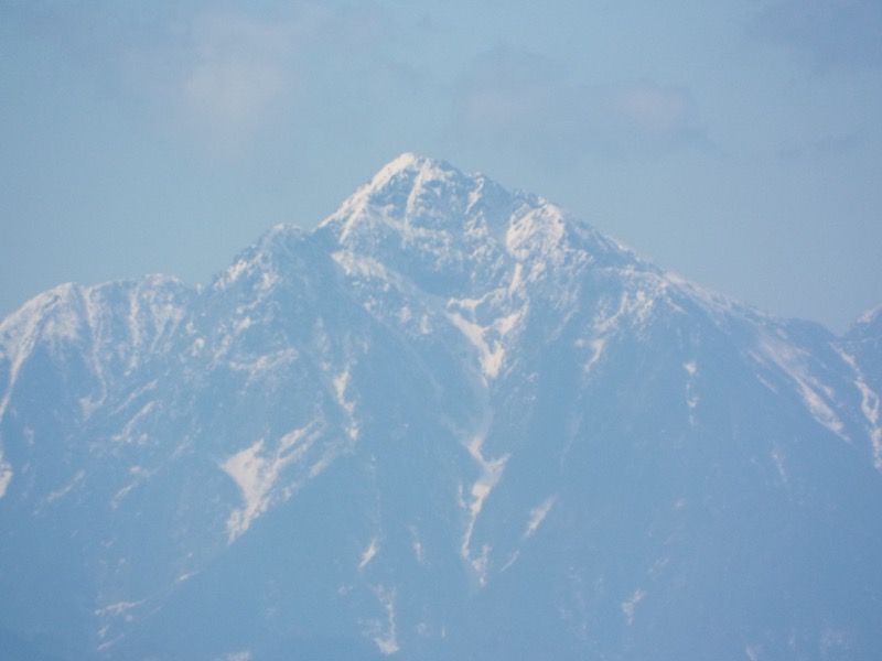 これは奥秩父(東アルプスと呼ぶ運動をしている人もいます)の金峰山。ランドマークの五丈岩が黒々と見えています。そこから左(正確には左奥)に下ったところにある岩山は瑞牆山です。