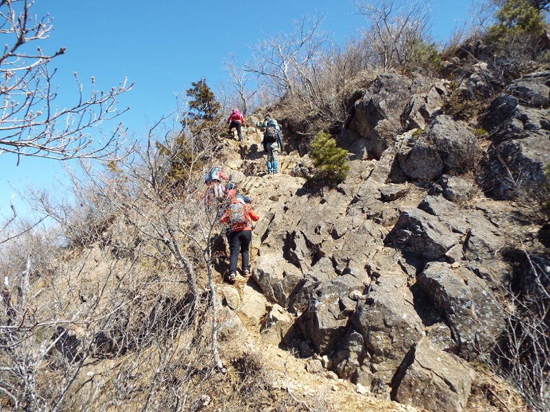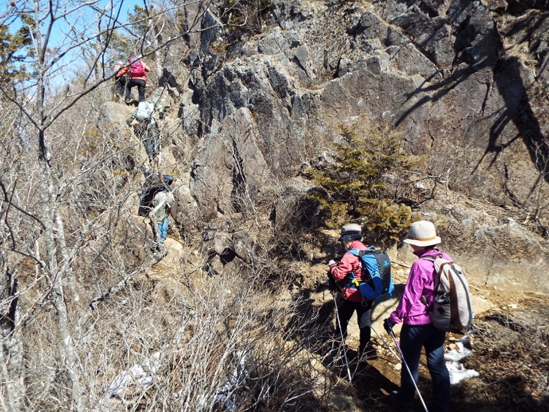 こういう岩場の通過は縦走路ではごく一般的なことです。放っておけばみなさん、どんなふうにでも通過していきます。でも入門編として、きちんとした三点支持を教わっておくことが重要だと考えます。自己流でも登れてしまうのですが、三点支持という面倒くさい方法をとるとどこがどう安全かという技術的考え方を、こういう易しところでも使えるように、身に着けておいてほしいのです。