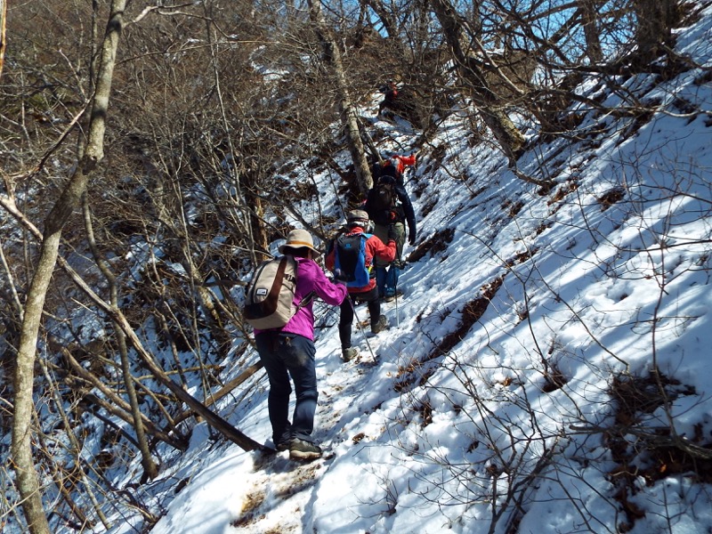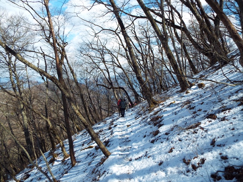 稜線の道は左右の斜面にトラバース(斜面横断)道が拓かれていることもあります。北斜面になるとこのとおり。ここが岩場だったりすると、アイゼンが必要になるかもしれません。