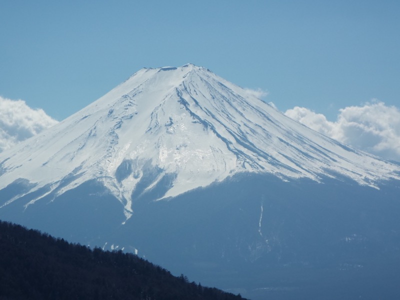 見えました。富士山。富士山山頂の右側、一番高く見えるところに以前は測候所のドームがあったのですが……。正面の窪みは吉田大沢。背面の大沢崩れほどではありませんが、ここでも崩落が進みつつあります。その左側に見える稜線に短かな横筋が何本も入っています。吉田口登山道です。