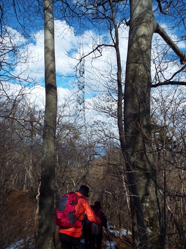 振り返ると変電所は尾根の陰に消えかかっています。背後の山は笹子雁ヶ腹摺山から連なる山々。遠くに大菩薩嶺(たぶん)が見えていますが、画面右手に稜線をたどると、牛奥ノ雁ヶ腹摺山、小金沢山を経て大菩薩へと伸びていきます。その縦走路を小金沢連嶺と呼ぶようですが、わかりやすくいえば南大菩薩の山々です。もうすこしわかりやすい展望があれば……。