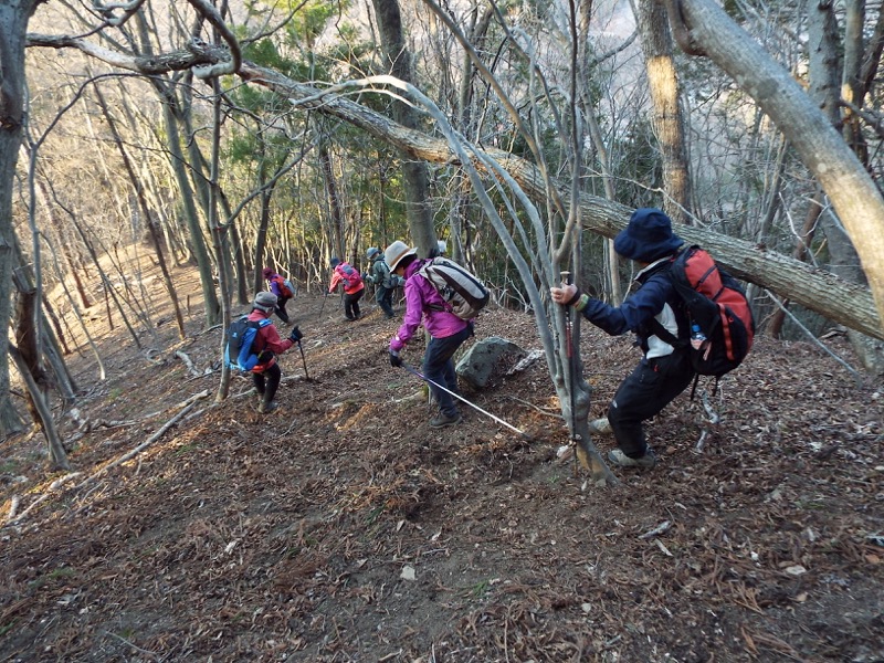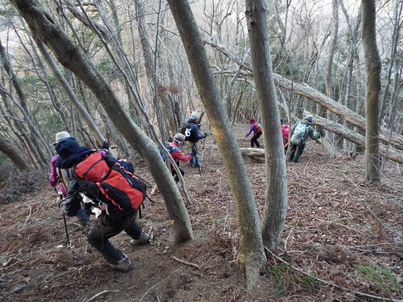 じつは14時30分に、怪しい道を下り始めたのです。以前、快適に歩いていたら踏み込んでしまった道で、下り始めたところに登山者が落としたらしいピルケースがありました。それで安心して下り始めたのですが、道はすぐに怪しくなって、みなさんを留めて、稜線まで戻ってみると、縦走路からあやしい道に踏み込んでしまったことが明らかになりました。笹子駅へと下る道は(地形図にはもともとありませんでしたが)、その先に見つかりました。