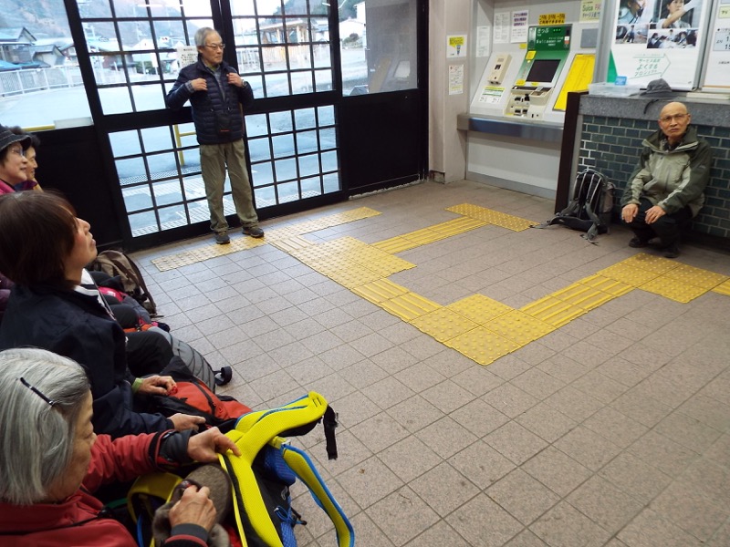 笹子駅では待ち時間がありました。最近落語を学び始めたSさんの小咄「雷様」の開演です。
