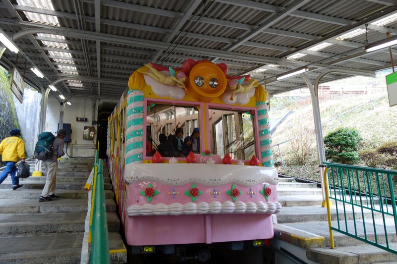 ケーブルカー駅の何の変哲もない不愛想な雰囲気からは想像できない可愛らしい車輌。