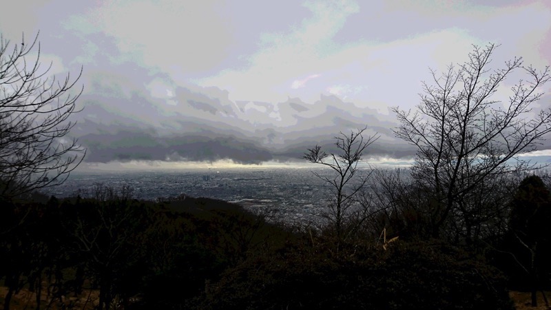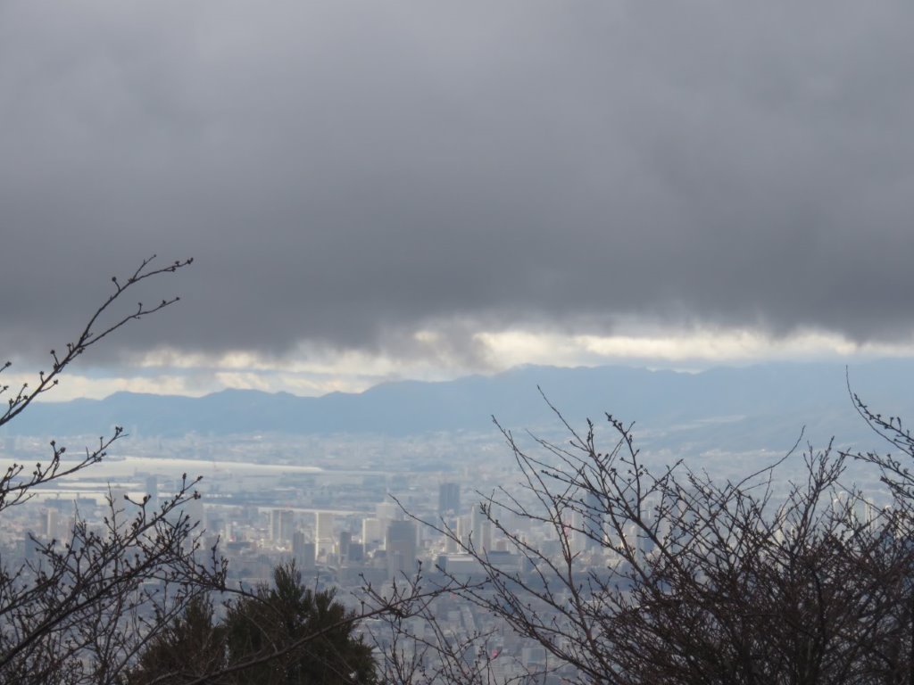 暫く歩いていくと(と言ってもかなり 難しい道で マップが あまりあてにならなかったが)急に視界が広がり 大阪湾〜大阪市が 見渡せた。しかし 暗雲が 立ち込めている。