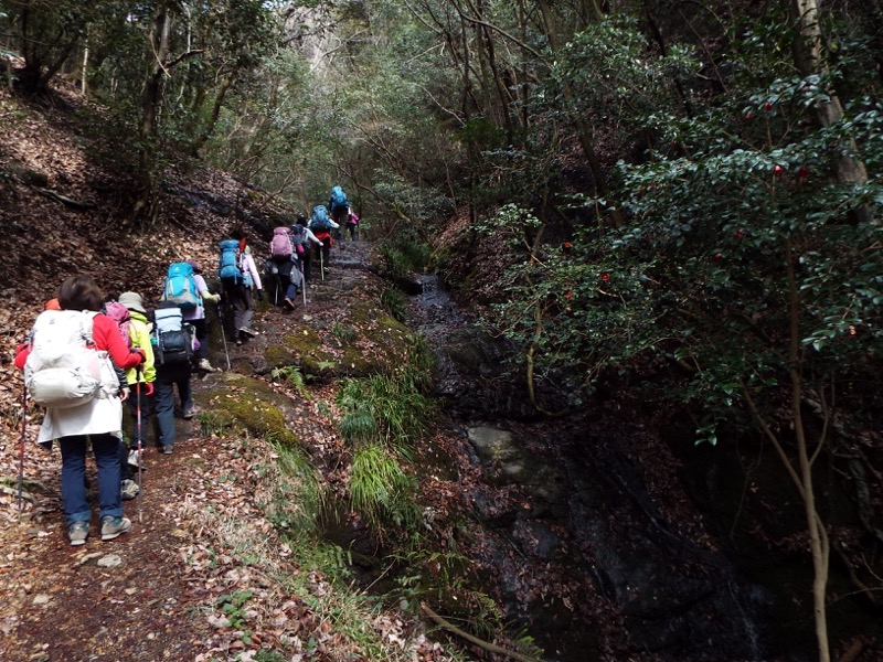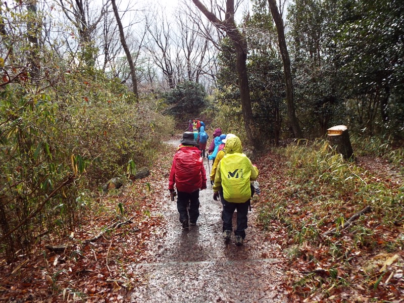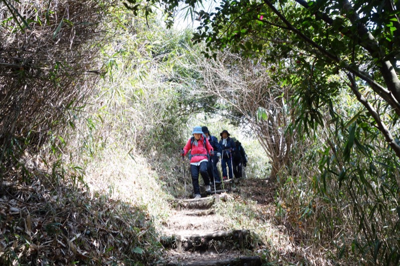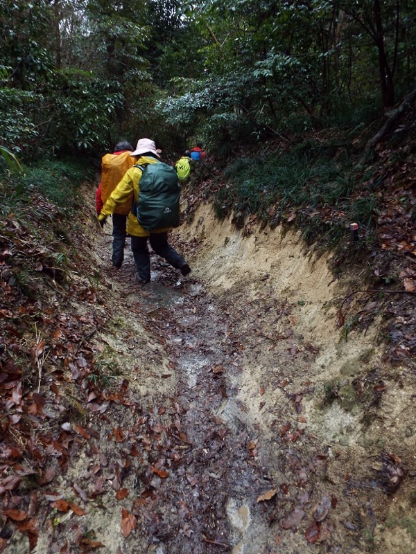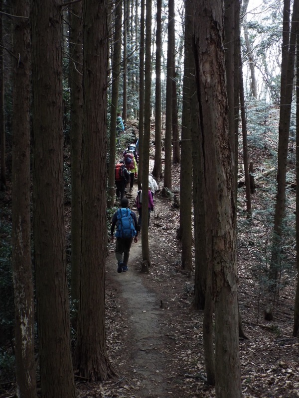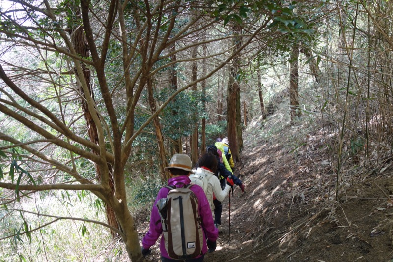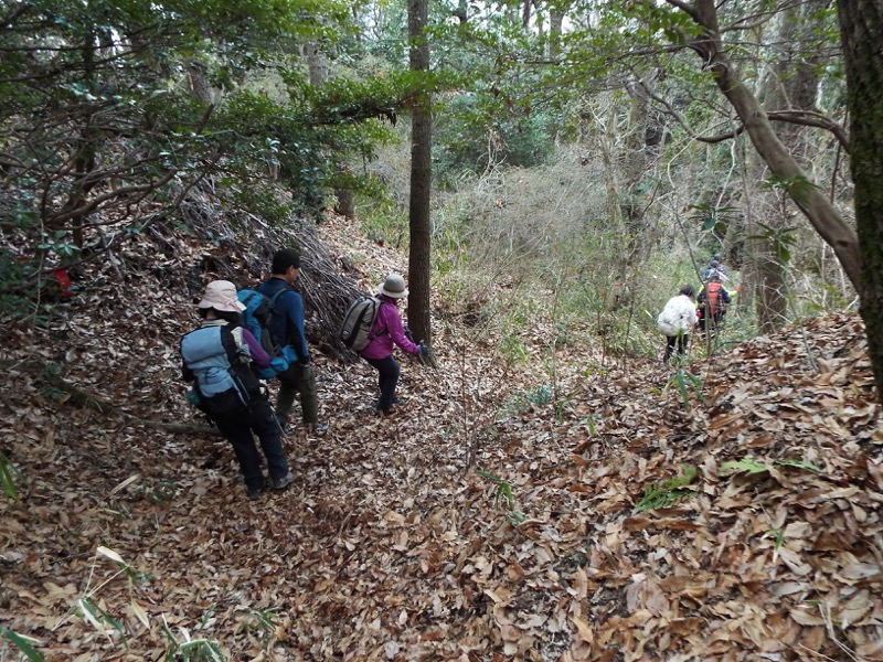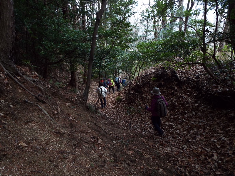 「近鉄」がネット上で公開している「生駒縦走コース」という詳細にしてわかりにくいイラストマップと地形図を持参して歩き始めたのですが、たちまちこういう歩道になって胸ちょっとワクワク、でもルートファインディング難しそう、という印象。いつもならみんなでトップを10分交代するところ、道の性格がわかるまでは私がトップを歩いています。