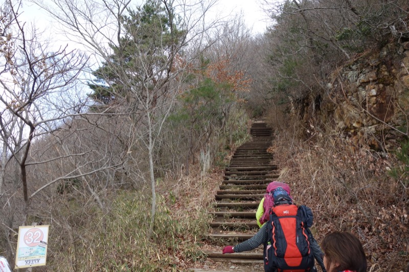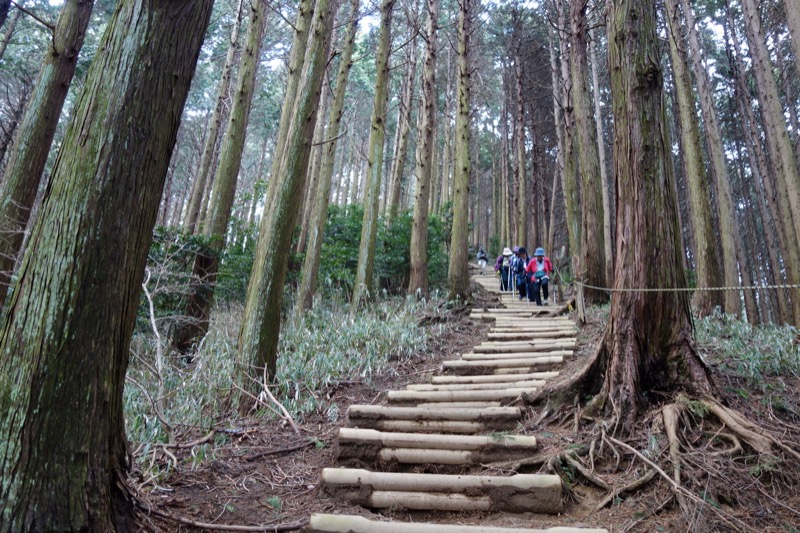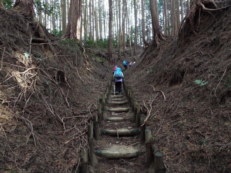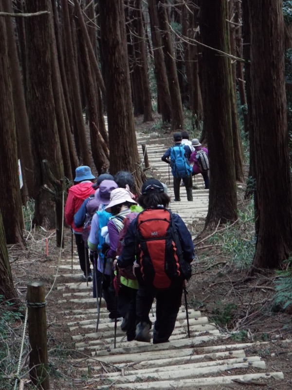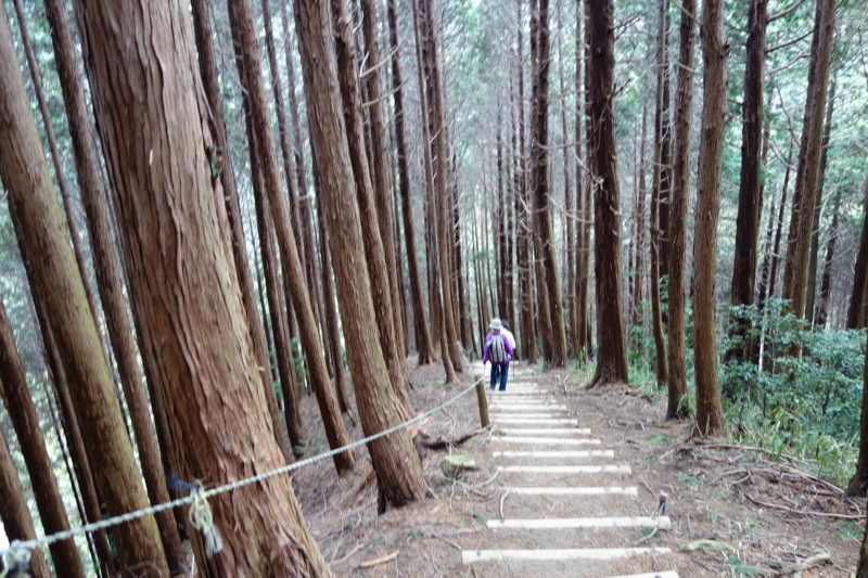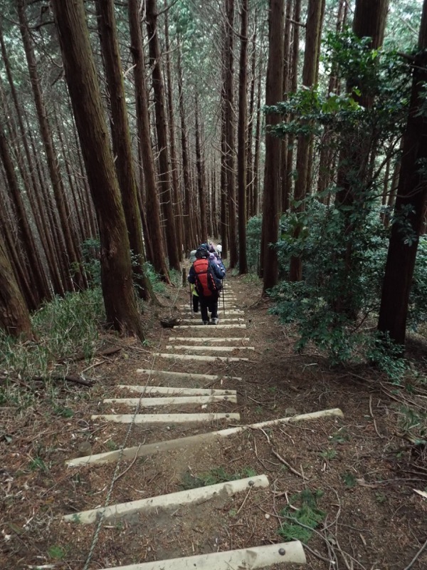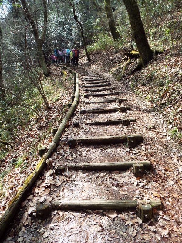 標高約400mの平石峠へと下って、標高659mの岩橋山へと登っていきます。それがおそろしく手間の掛かったこの階段道。土留めが主、階段が副なので登山者がいやがる道です。