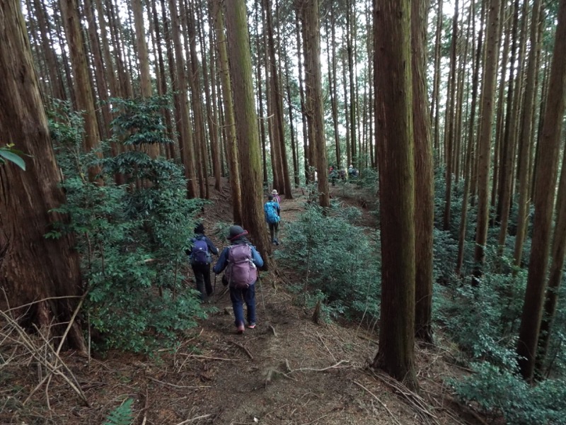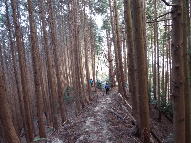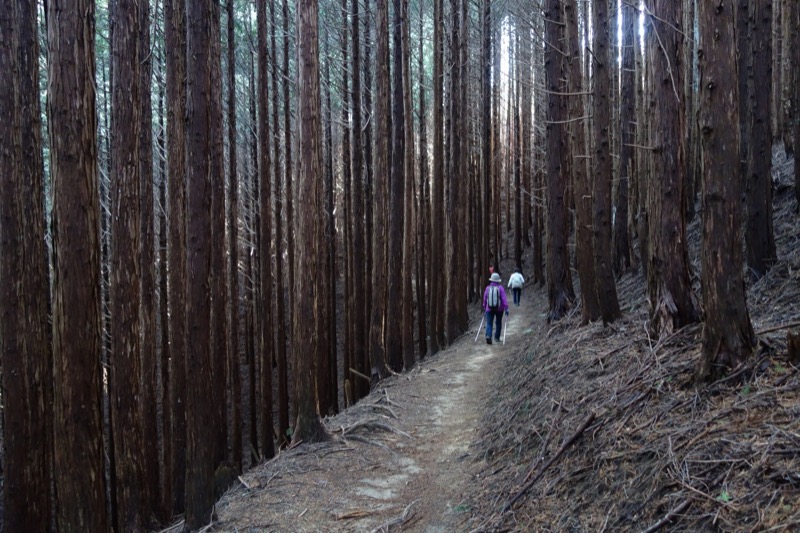 稜線といっても標高400〜450mを行ったり来たりの道で、ここでは奈良県側が人工林、大阪府側が自然林という県境をたどっています。