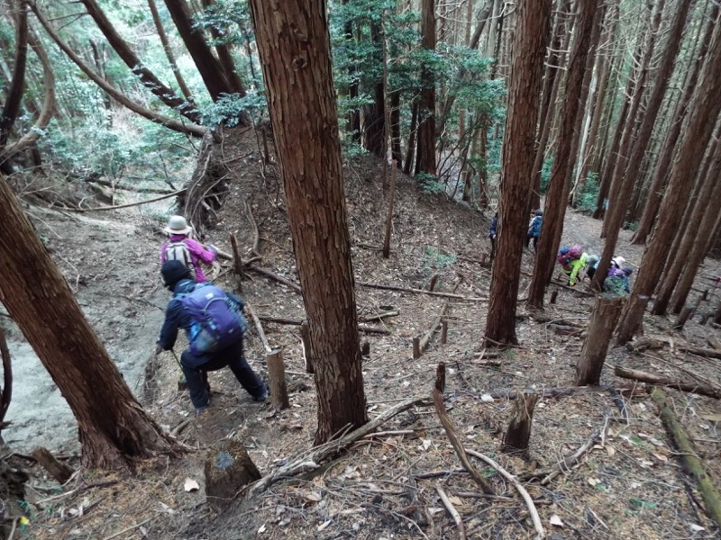 じつは稜線から奈良側に下り始めたところです。葛城山までまだ1時間というところ、地形図にある標高726m峰のところから下山路がありました。葛城山頂の国民宿舎に泊まる予定の2人と分かれて、私たちは東京へ向けての帰路が始まりました。