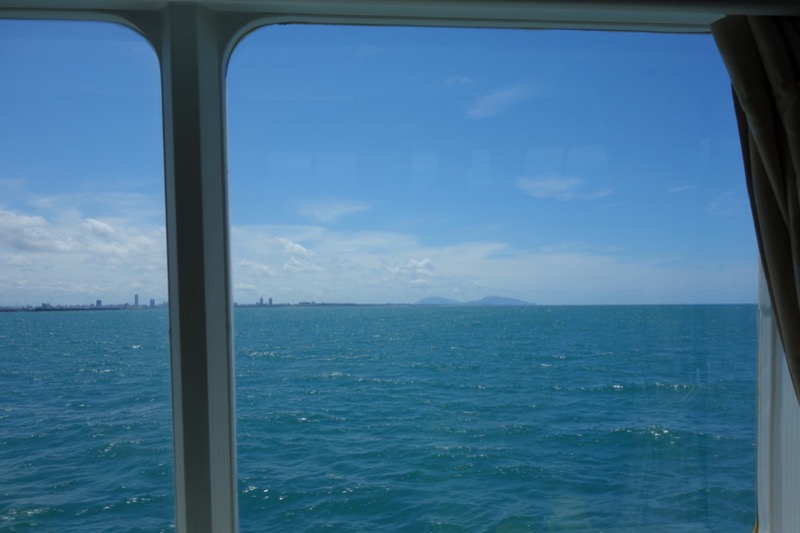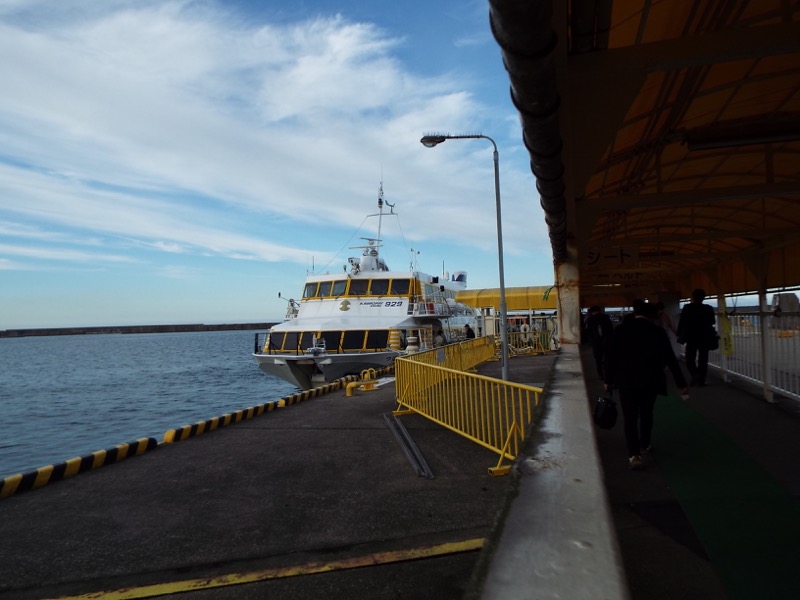 ジェットフォイルも晴れていると気持ちがいい。窓から見えている海沿いの山は弥彦山? 角田山? それとも米山?