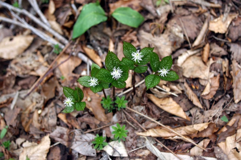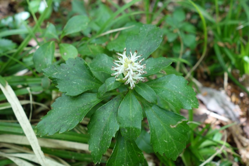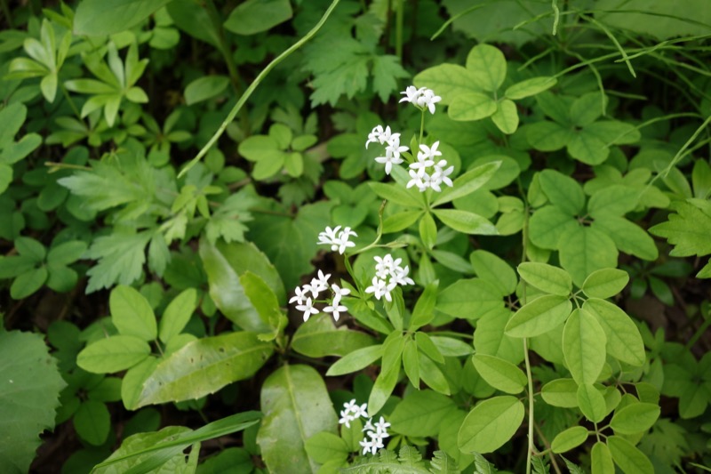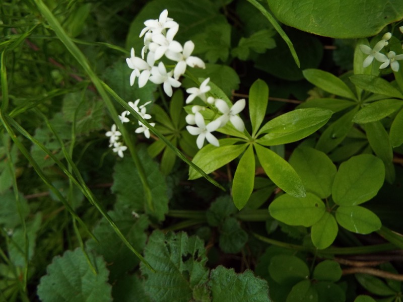 これはクルマバソウかと思っていましたが、調べてみると葉が6枚(クルマバソウなら6〜10枚)で白い花がまばら(クルマバソウならもっとにぎやか)ということでおそらくクルマムグラ。