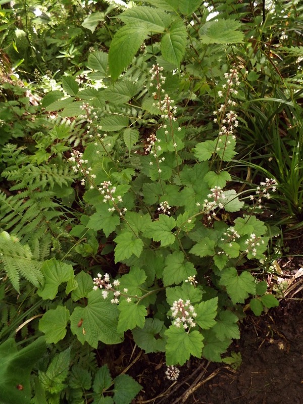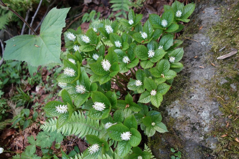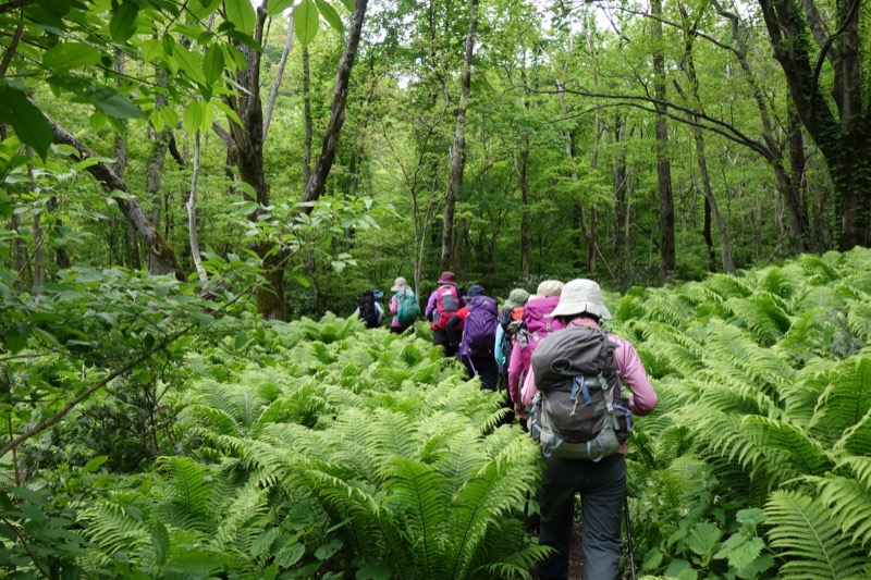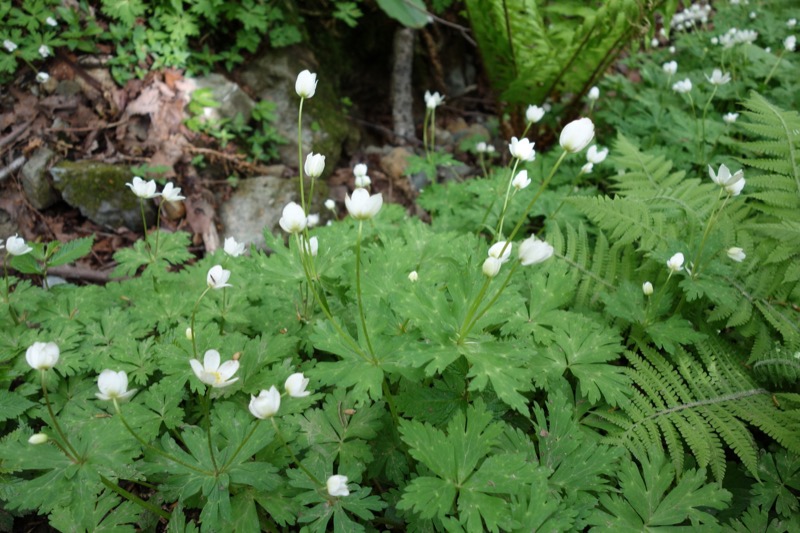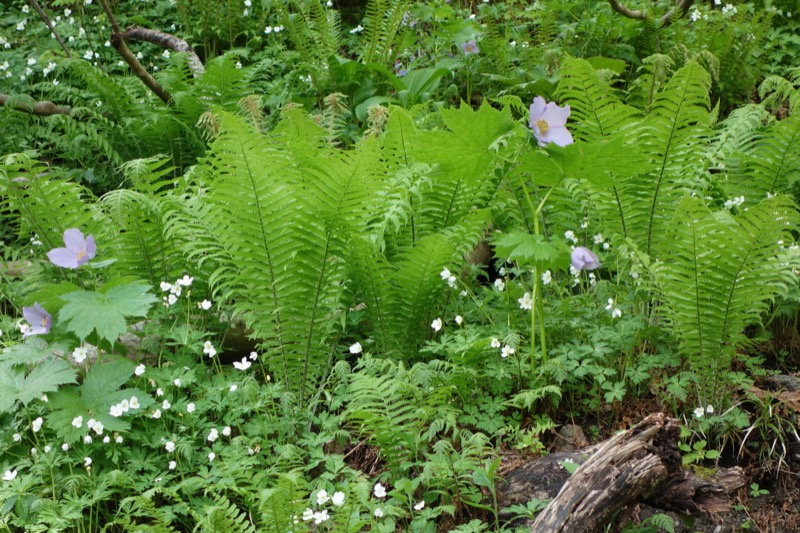 山でよく見るこの美しいシダの名前はわかりません。とりあえずや尾瀬で有名なヤマドリゼンマイとしておきたいのですが、真ん中に胞子葉というゼンマイふうの穂がでているのを、ヤマドリ色というのだそうです。それが見えないので、いつもまったくわかりません。ヤマドリゼンマイの胞子葉のフリをしている白い花も、じつはよくわかりませんが、秋田駒ケ岳のイワテハタザオに似ているかなと思うので、ヤマハタザオということにしておきたいと思います。