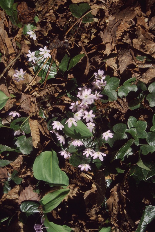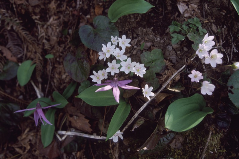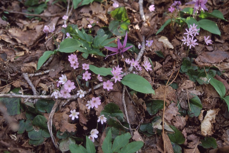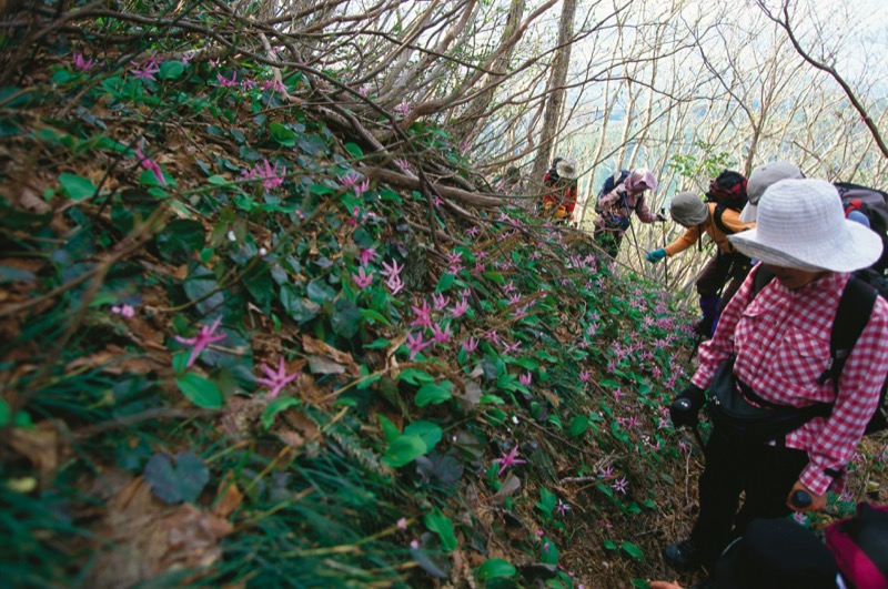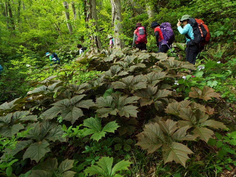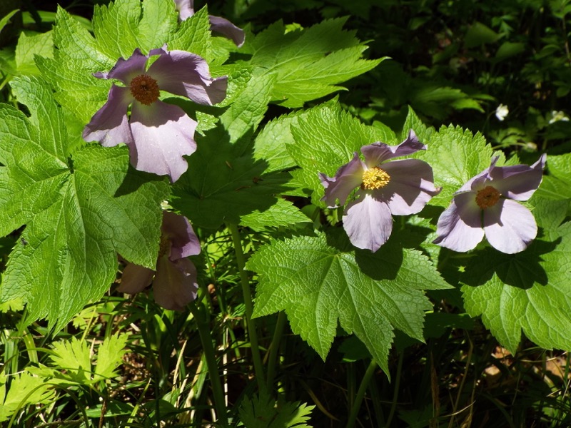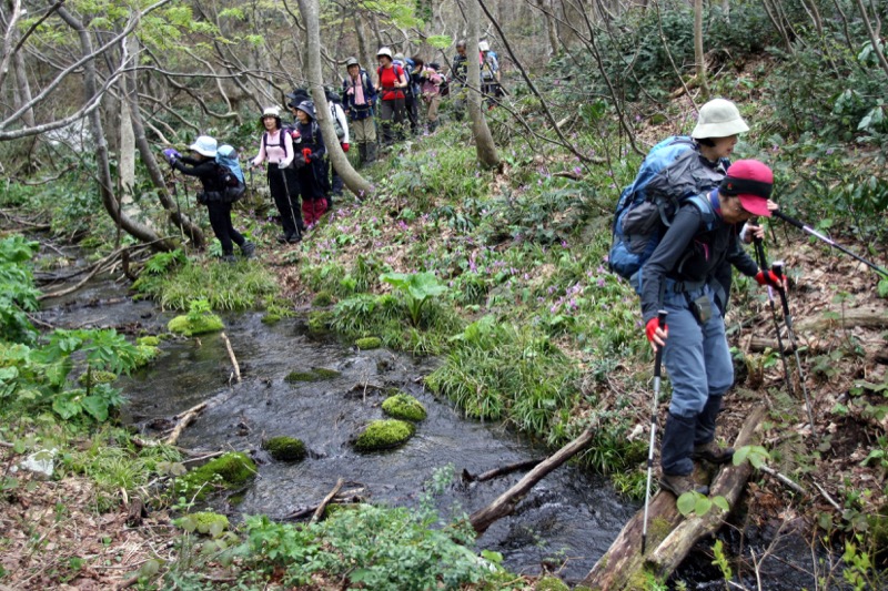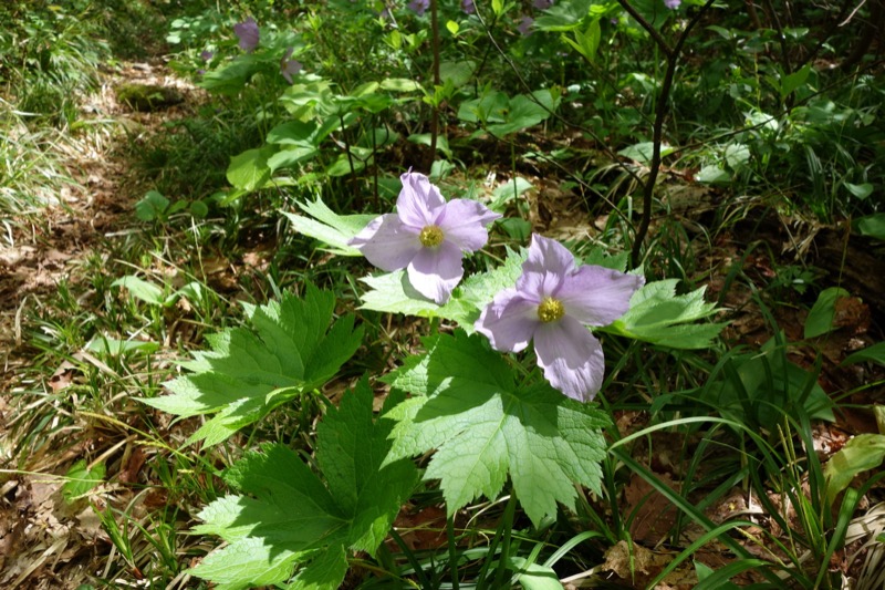 「4月 フクジュソウ、オオミスミソウ(雪割草)に始まりショウジョウバカマ、キクザキイチゲ、5月にはオオタチツボスミレ、エチゴキジムシロ、足の踏み場もない程に咲くカタクリやニリンソウ、ひっそりとヒトリシズカも捨てがたい。何より自慢の高山の花、シラネアオイの群落は日本一ともいわれてる。その他ヤマシャクヤクやサンカヨウも可憐な風合いを見せている。尾根筋にはザゼンソウも群落をなしている」