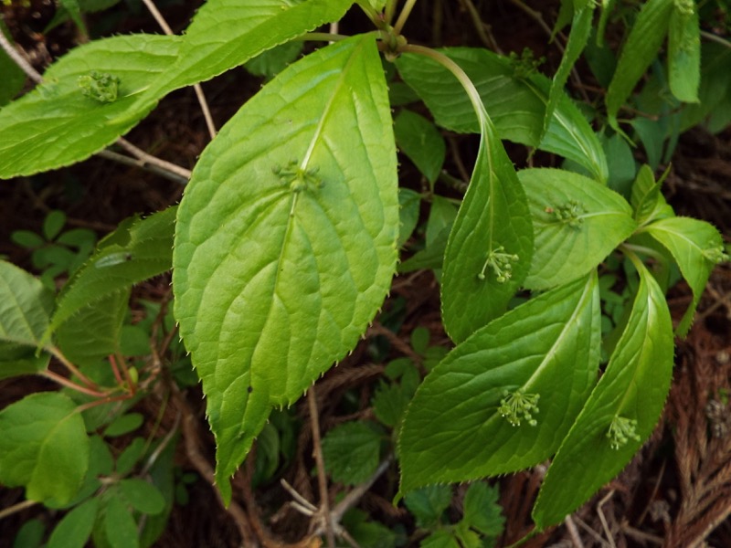 *何の花か分かりませんが、ハナイカダでもヒョウタンボクの仲間でもないと思います。ハナイカダは葉の真ん中に花(雄あるいは雌)が付くし、ヒョウタンボクの仲間は葉に大きな鋸歯はないようなので。
