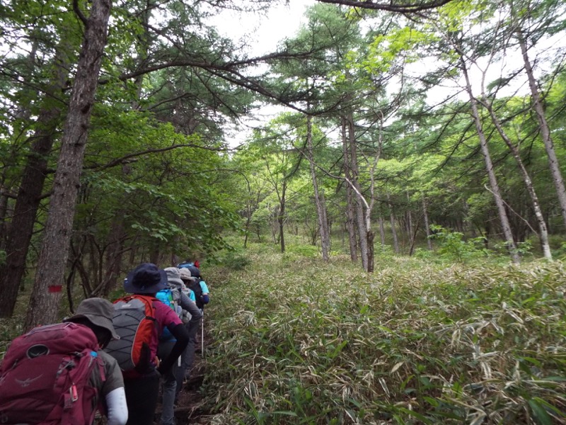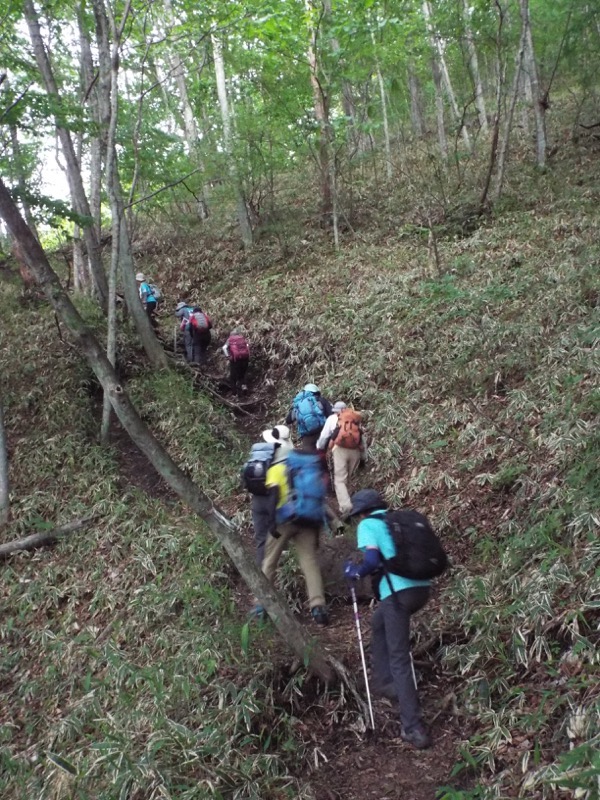 掃部ヶ岳への登山道と比べると、こちらのほうが健全に見えます。同じ作りなので安全のためにつけられた手すりロープのつもりなのでしょうがが、これはむしろ初心者が道を外さないためのようにつけたガードと私には見えます。この道は下りでちょっと焦ったりするとすぐに道をはずれますから。