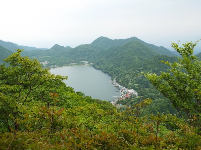 右奥がバスを降りた「湖畔」。眼下の建物が登山口の榛名湖荘。