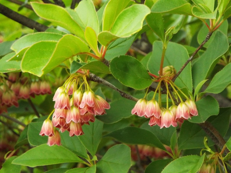 サラサドウダンの花は基部に白があり、先端から紅色が線状に入って、全面紅色のベニサラサドウダンとは違います。葉っぱにも特徴があって、写真中央の葉に見えますが、縁に毛のようなギザギザ(微小鋸歯)があります。