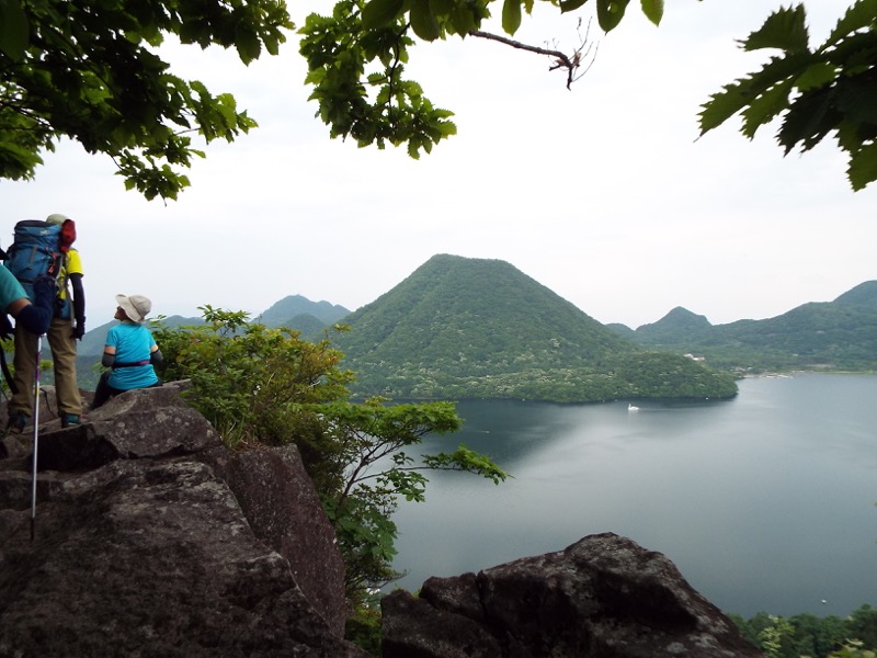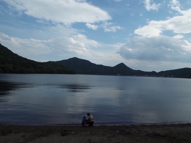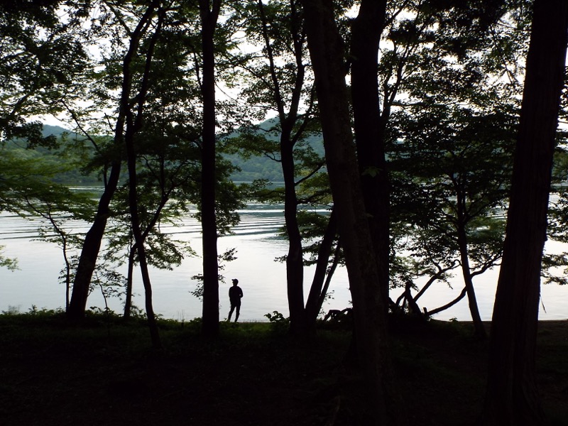 湖畔の道を西岸から北岸に向かって歩いています。釣り人やら観光船やら。6月の第2土曜日の榛名湖です。