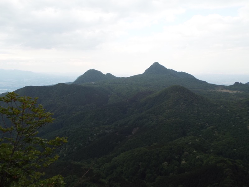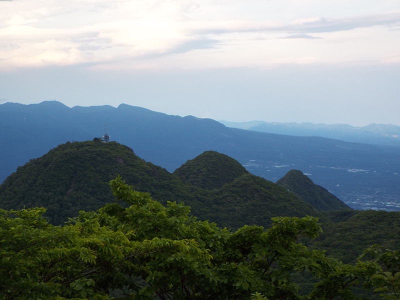 丸い山頂に電波塔が立っているのが二ッ岳の雄岳、その右が雌岳、さらにその右に水沢山。背後に広がるのは赤城山。