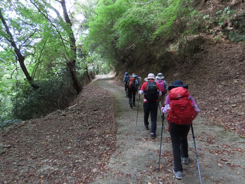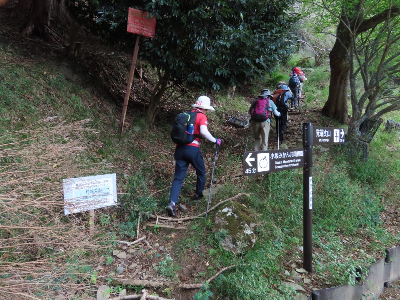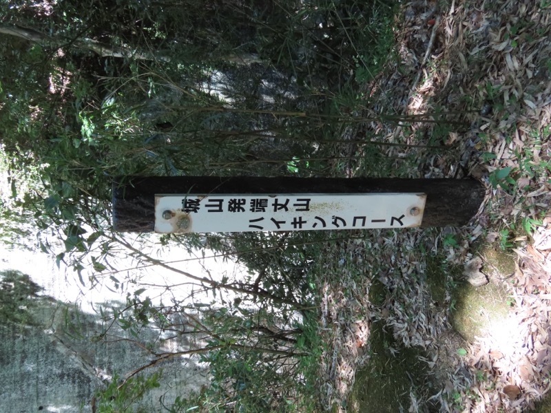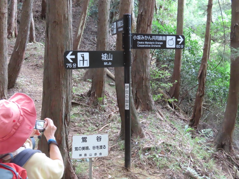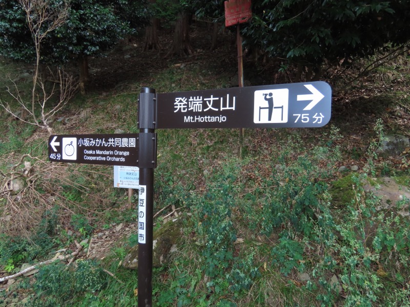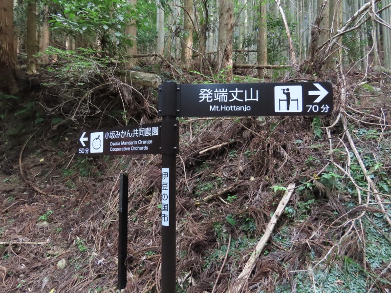 1435ごろ林道にでる。進行方向の標識には「小阪みかん共同農園・50分」のみ。「伊豆の国市」の新品の立派な道標なので、葛城山の新しい動きと連動したものと想像できる。