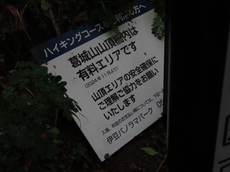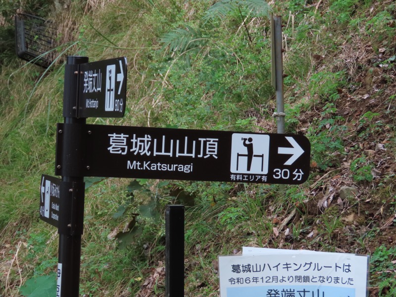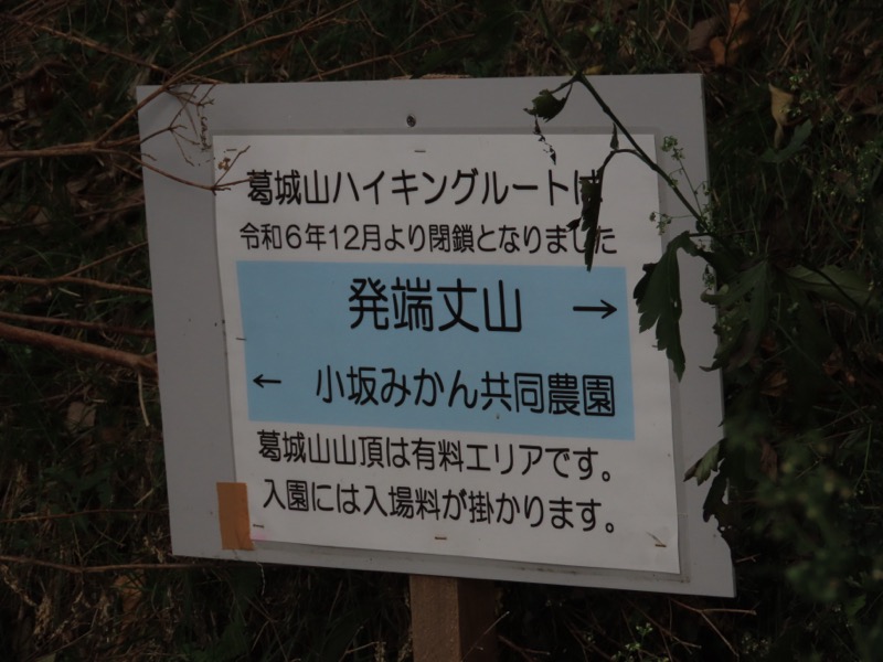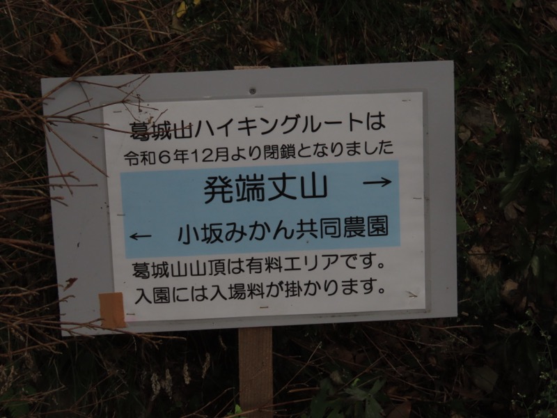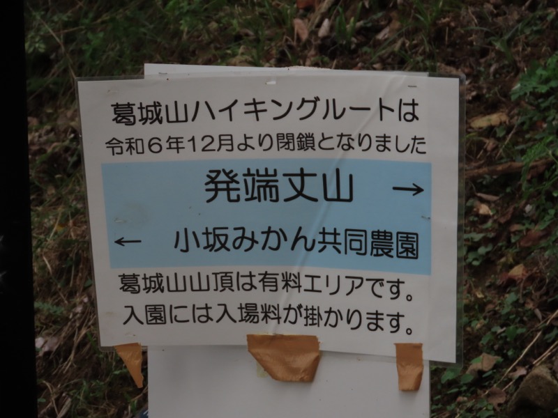 1450ごろ_以前葛城山への登山口だったところに「葛城山ハイキングルートは令和6年12月より閉鎖となりました」「葛城山山頂は有料エリアです。入園には入場料が掛かります」という表示。