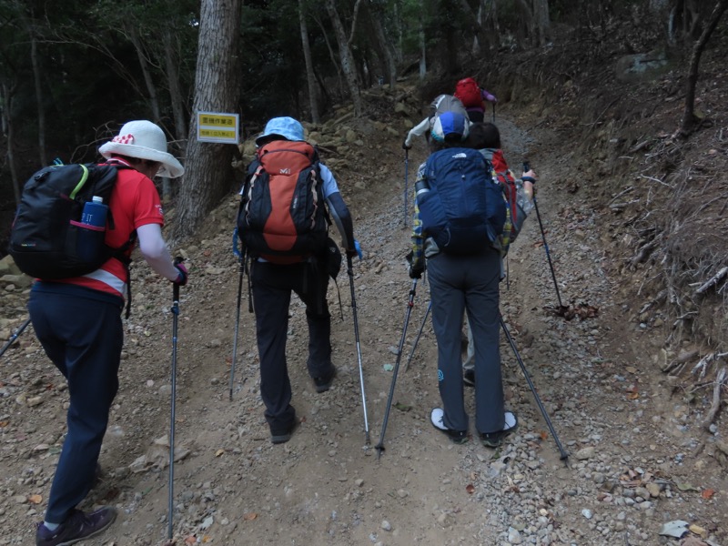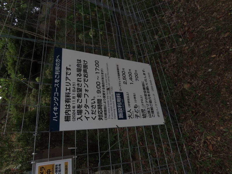 1510ごろ_きちんとした登山道があって、入口には「閉鎖」の看板。また別の標識には「葛城山山頂柵内は有料エリアです(2024年11月より)」とあり「入場、料金のお支払いについては。下記へ」というような記述があったので、とりあえず「山頂柵内」へ入ることができる、と判断して登ることに。(標高約250m)